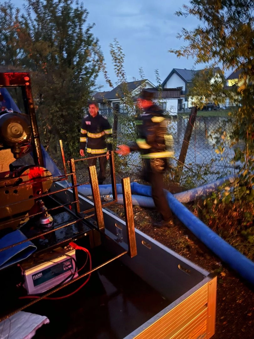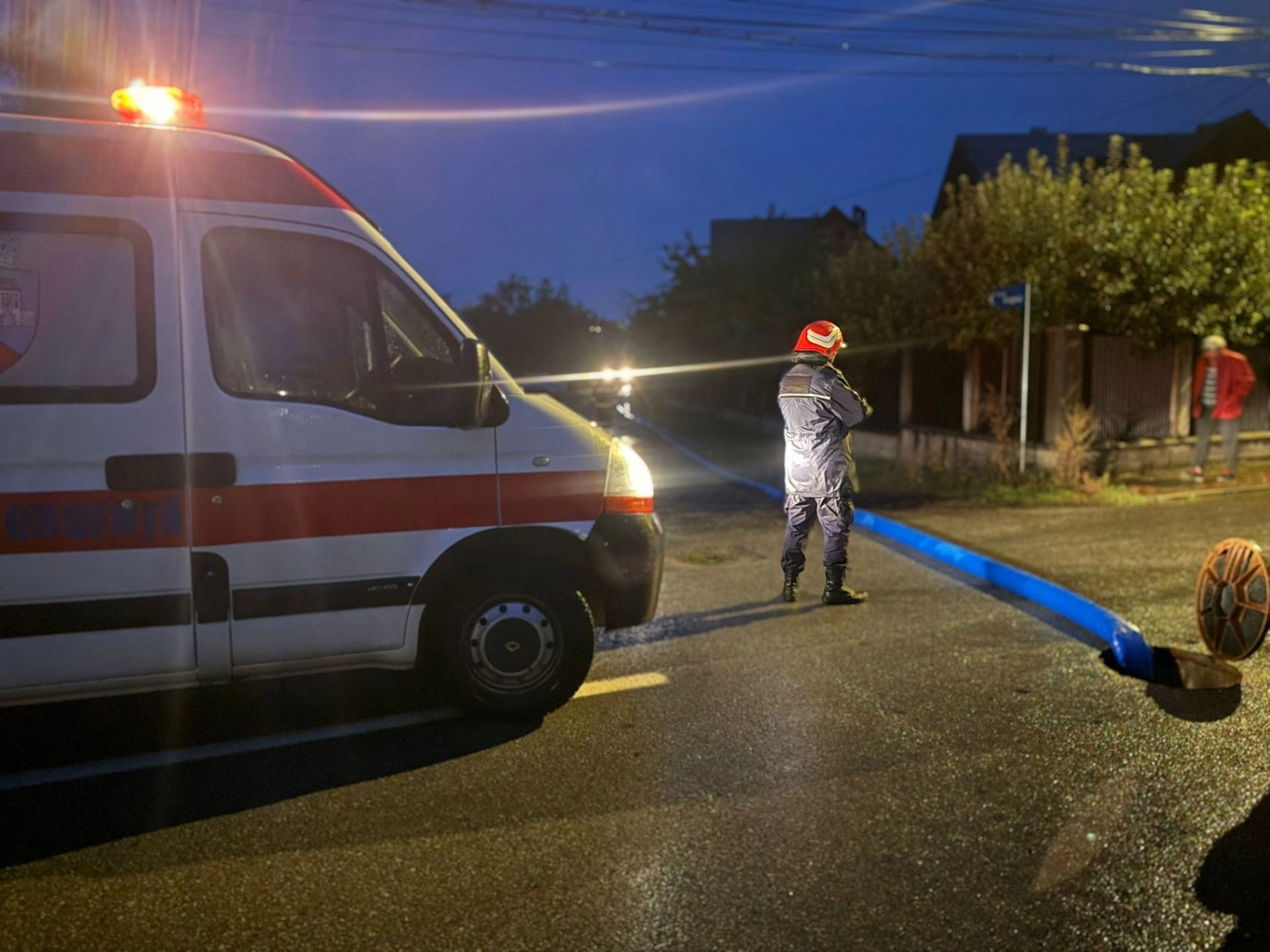 Echipaje de pompieri militari cu autopompe intervin în municipiul Bistrița, străzile Vasile Goldiș (cinci gospodării afectate) și Vasile Lucaciu (trei beciuri inundate).