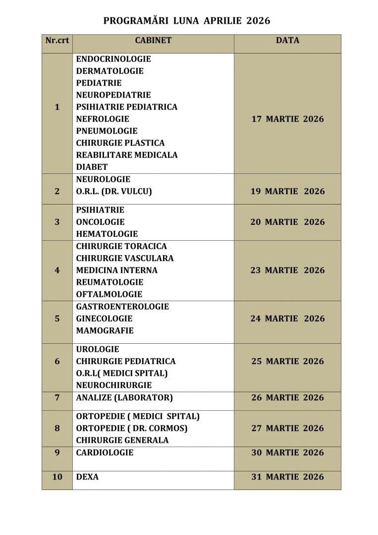 Vă comunicăm datele de la care se vor putea face programări la specialitățile medicale / paraclinice din Policlinica Bistrița, pentru luna aprilie 2026.