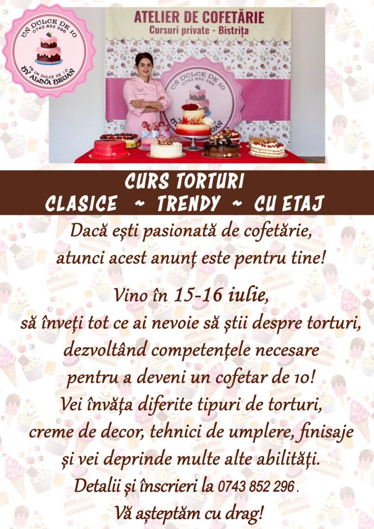 Dacă ai o pasiune pentru deserturi fine și visezi să creezi torturi spectaculoase care să cucerească gustul și privirea, poți învăța tehnici și secrete, în cadrul unui curs profesionist.