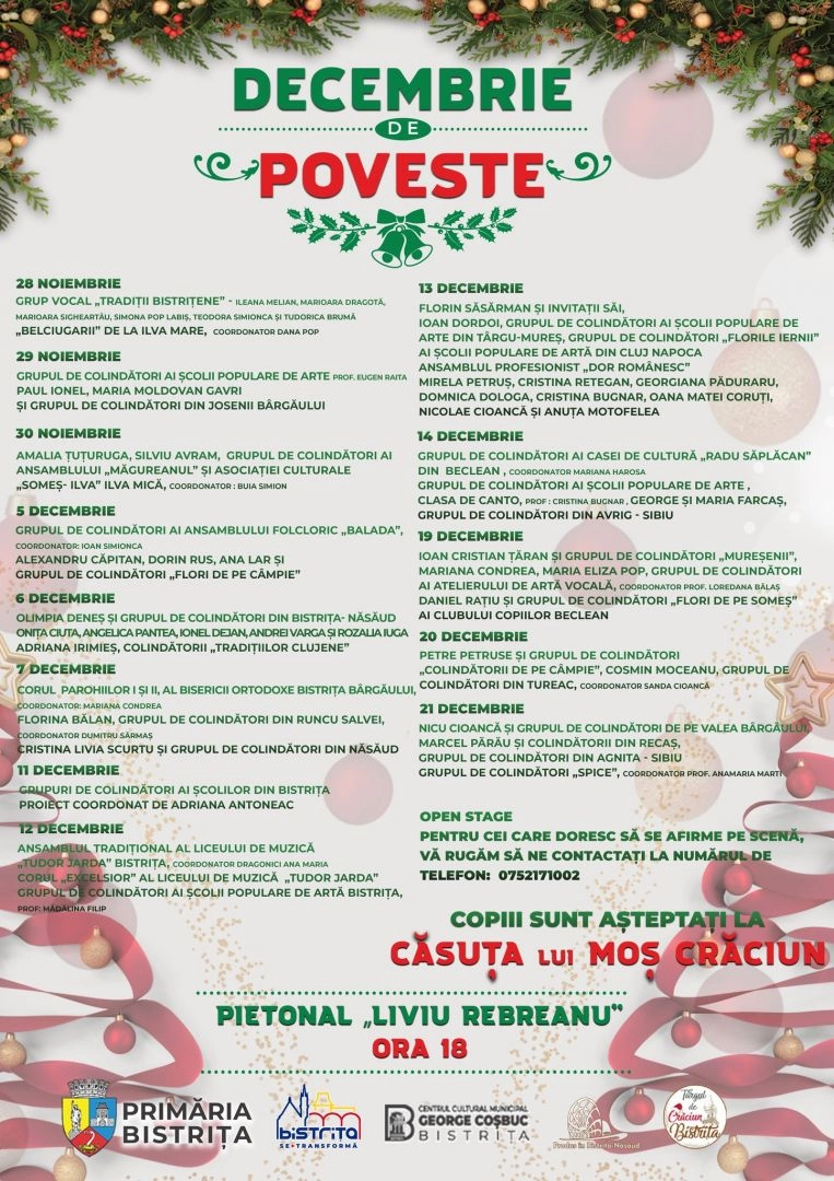 Pe Pietonalul „Liviu Rebreanu”, în fiecare zi de vineri, sâmbătă și duminică de la ora 18:00, Primăria Bistrița a pregătit un program de colinde, tradiții, momente speciale pregătite de artiști, ansambluri și grupuri de colindători din Bistrița și din întreaga țară.