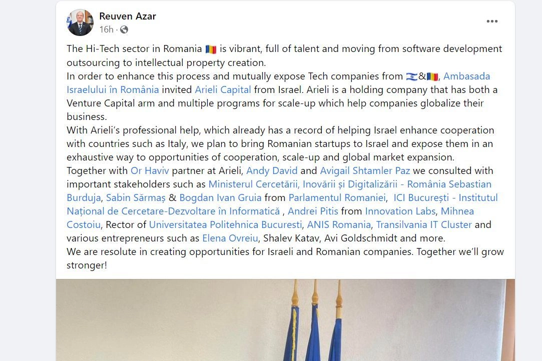 "Sectorul Hi-Tech din România este vibrant, plin de talente, în continuă mișcare, de la externalizarea dezvoltării software, la crearea de proprietate intelectuală. Pentru a îmbunătăți acest proces și a expune reciproc companiile Tech din Israel și România, Ambasada Israelului în România a invitat-o pe Arieli Capital din Israel. Arieli este o companie, care are atât o ramură cu capital de risc, cât și mai multe programe de extindere care ajută companiile să își globalizeze afacerile", a transmis Reuven Azar.