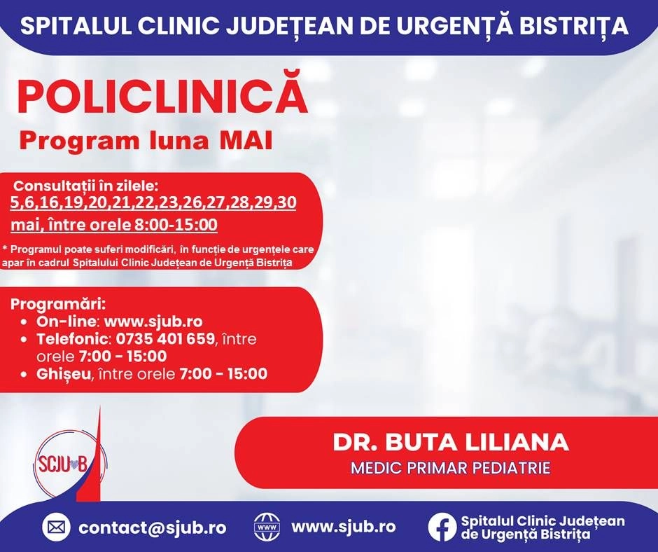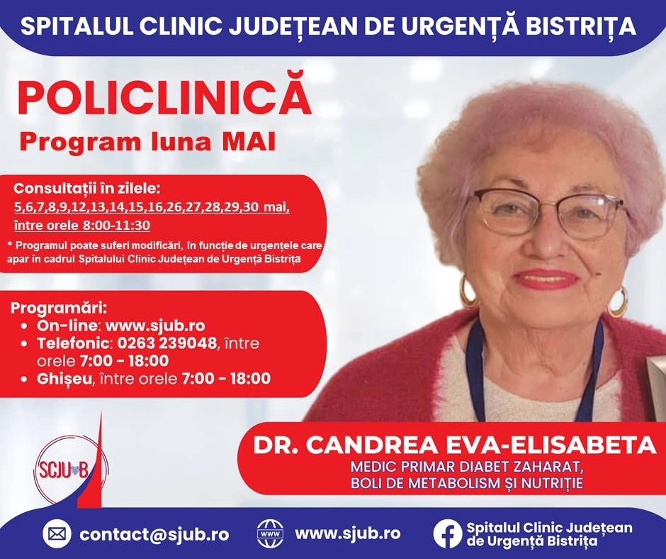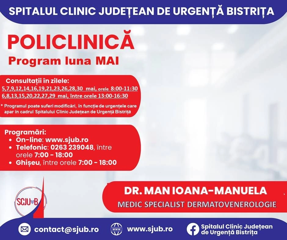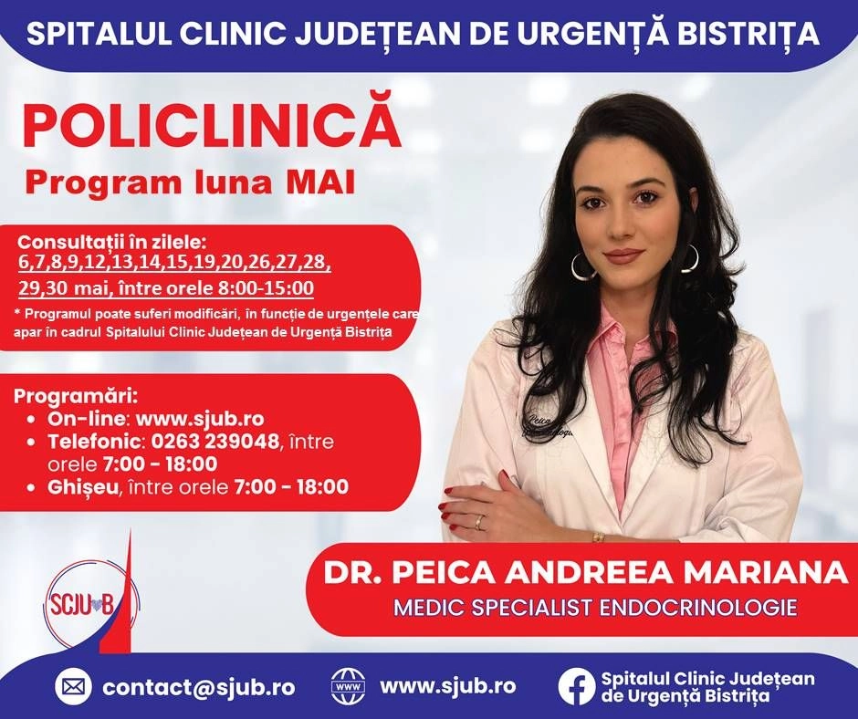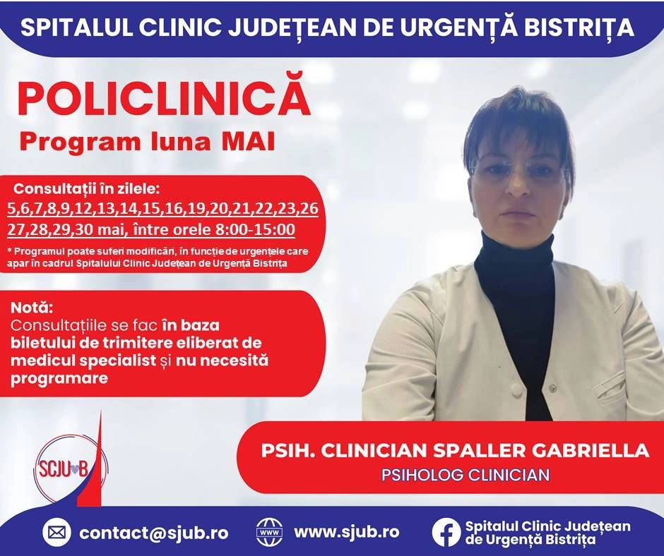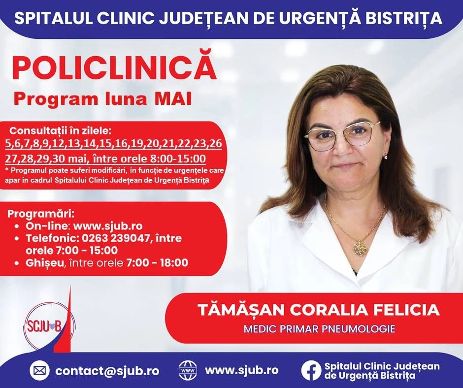 Începând de mâine, 17 aprilie, vor fi deschise programările pentru consultațiile care se vor putea efectua în luna mai, la următoarele specialități medicale din Policlinica Bistrița (strada Gării, nr. 9-11, mun. Bistrița):