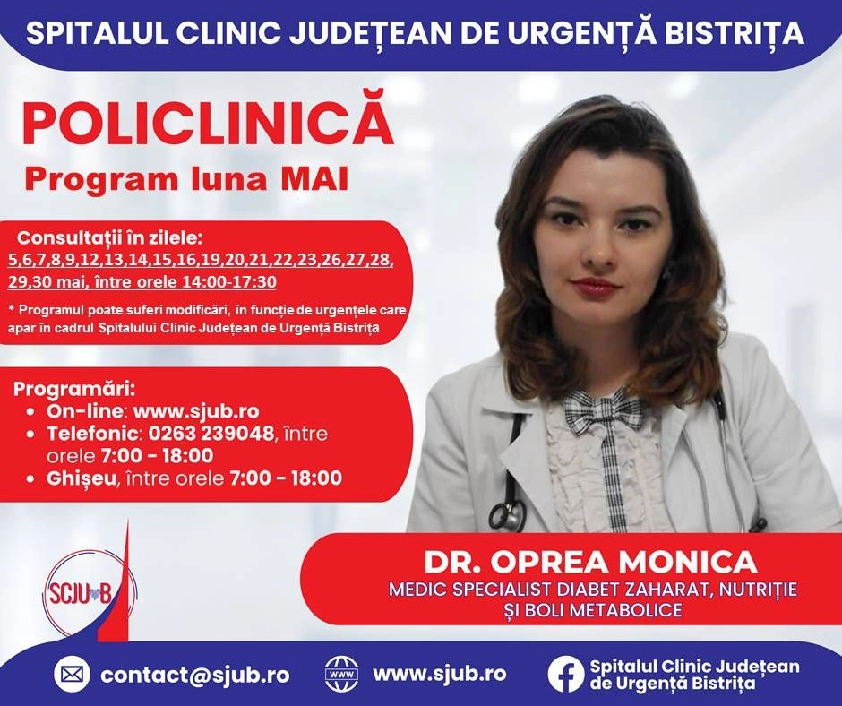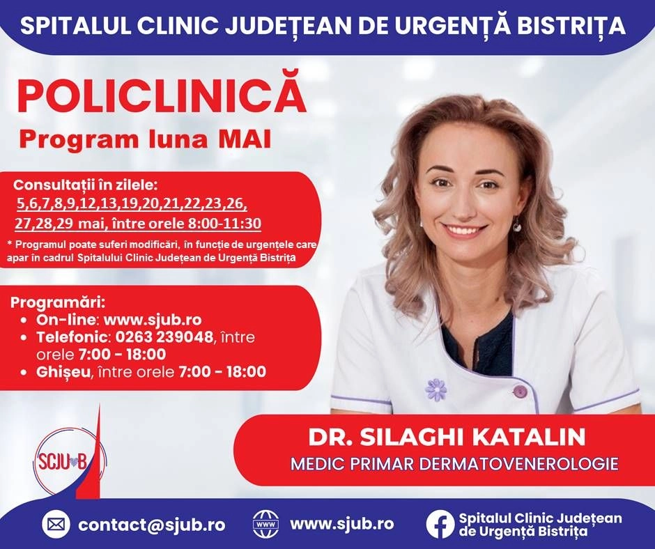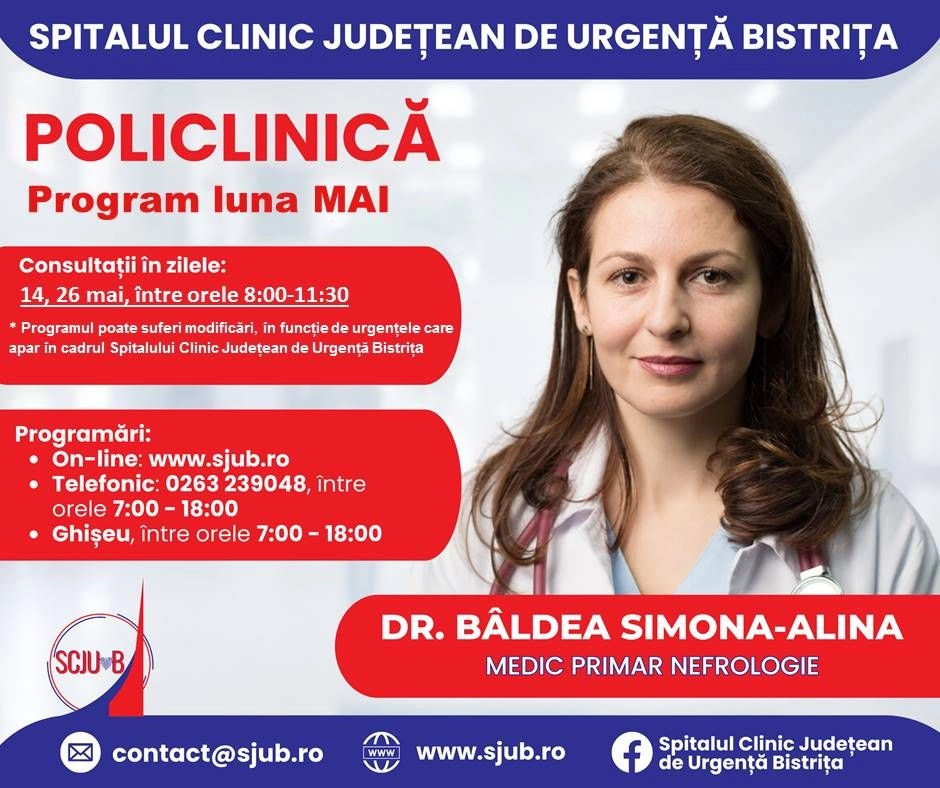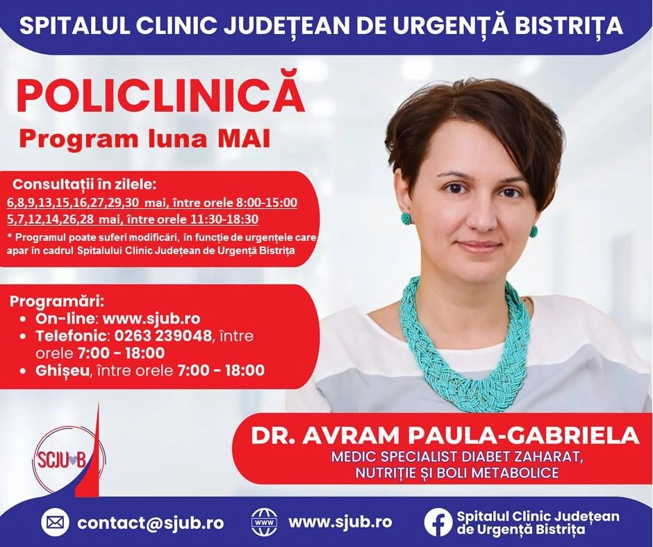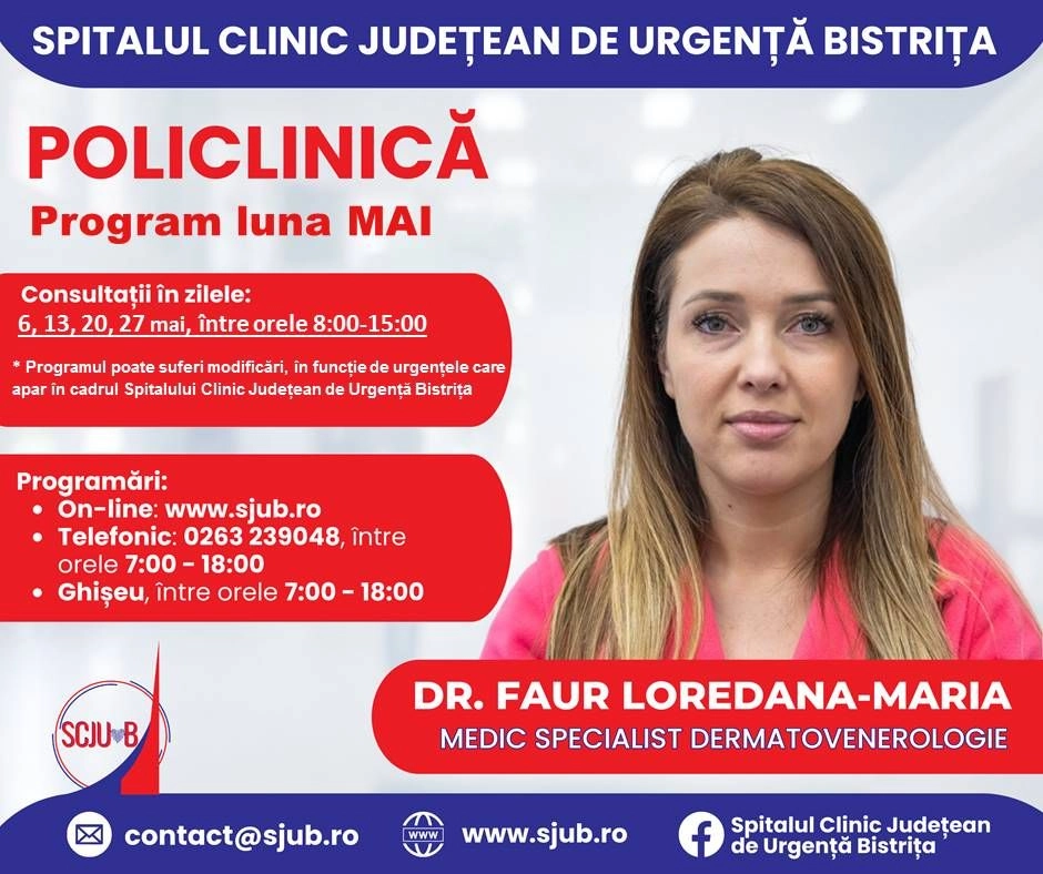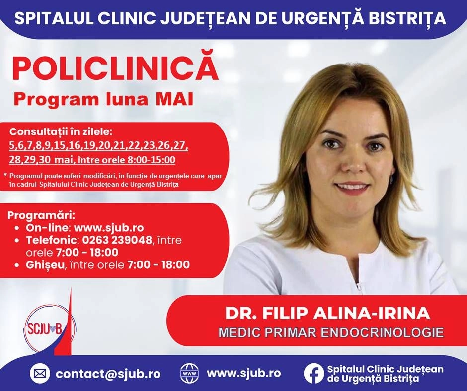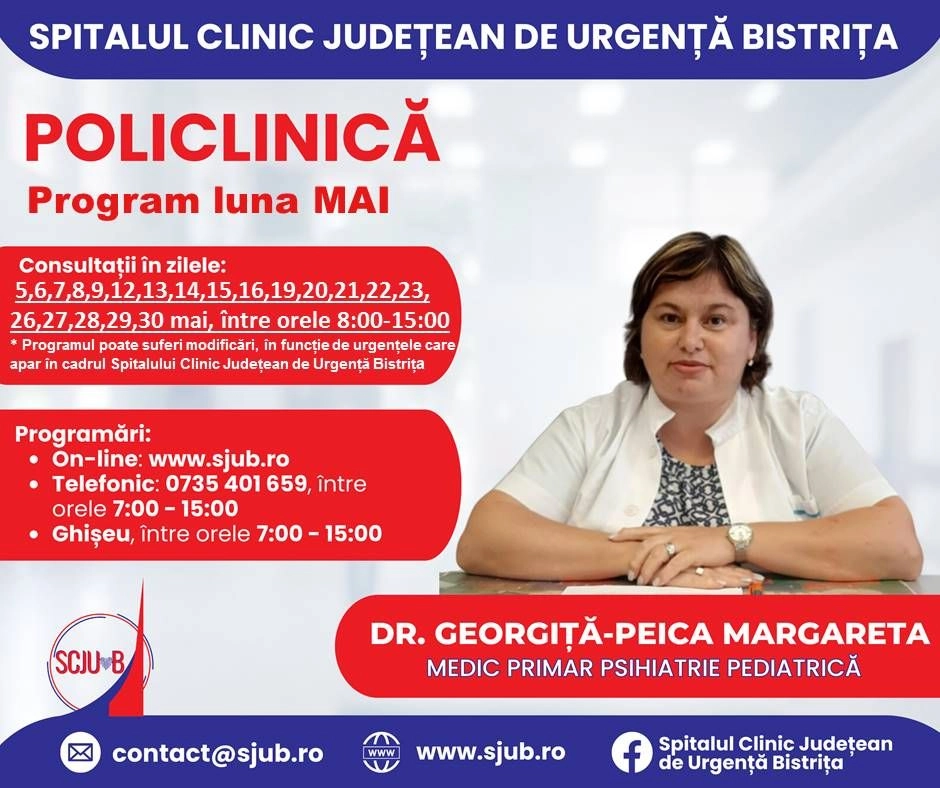 Începând de mâine, 17 aprilie, vor fi deschise programările pentru consultațiile care se vor putea efectua în luna mai, la următoarele specialități medicale din Policlinica Bistrița (strada Gării, nr. 9-11, mun. Bistrița):