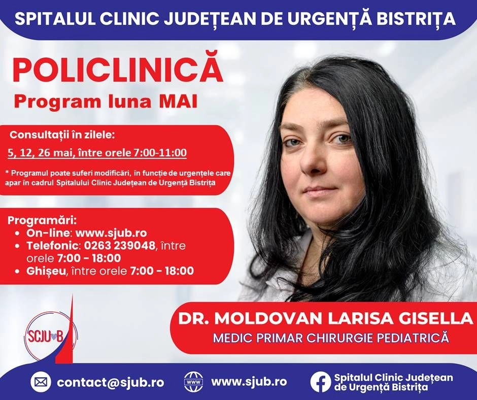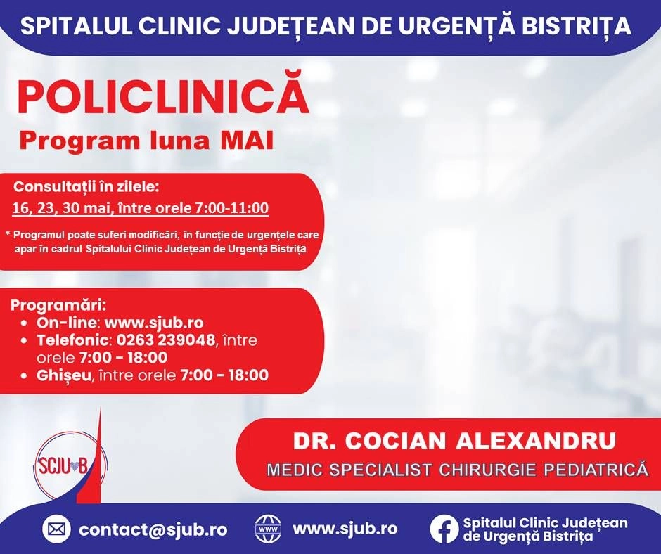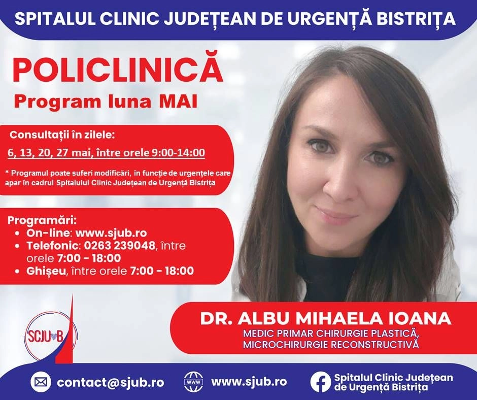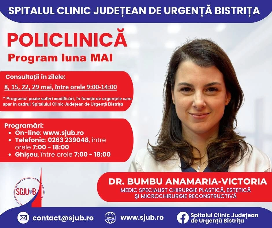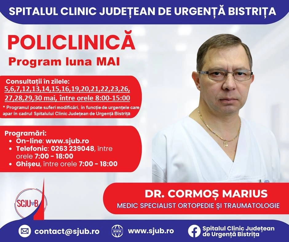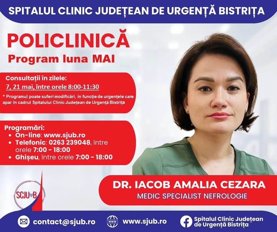 Începând de mâine, 17 aprilie, vor fi deschise programările pentru consultațiile care se vor putea efectua în luna mai, la următoarele specialități medicale din Policlinica Bistrița (strada Gării, nr. 9-11, mun. Bistrița):