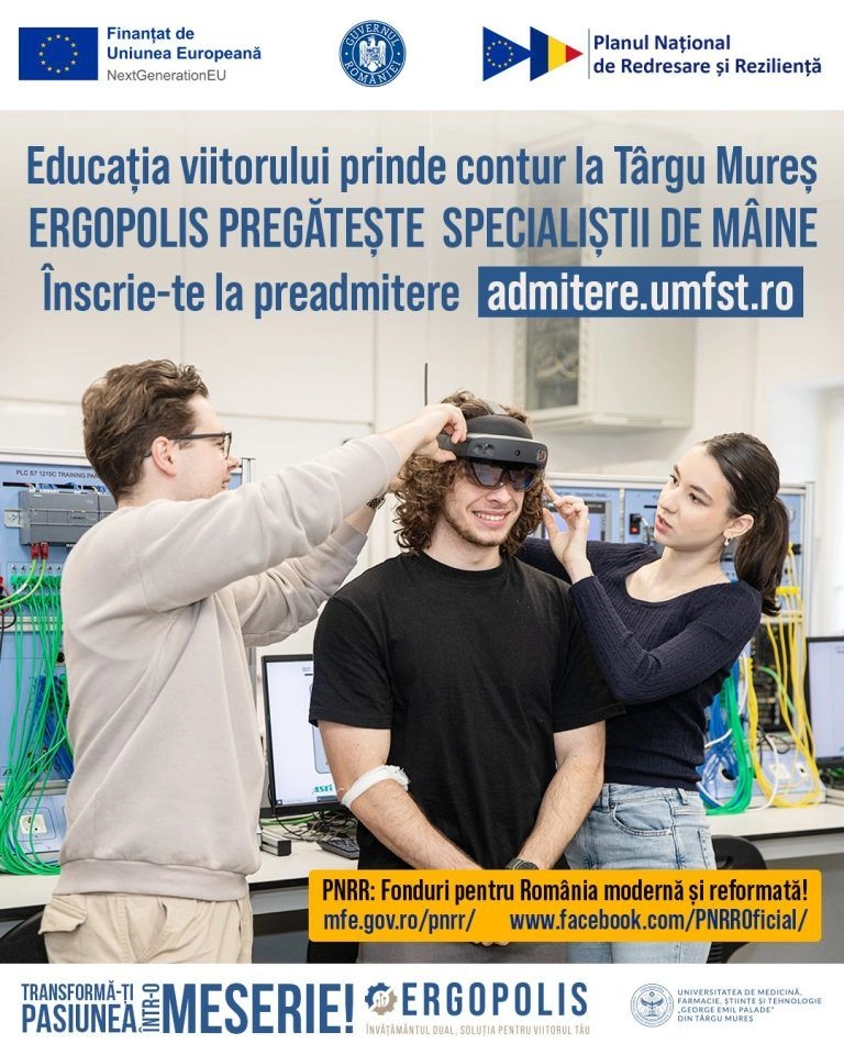 Consorțiul ERGOPOLIS pregătește specialiștii de mâine, iar preadmiterea este în plină desfășurare. Sub egida UMFST G.E. Palade Târgu Mureș, Consorțiul Regional pentru Învățământ Dual ERGOPOLIS transformă radical peisajul educațional din județul Mureș. Prin fuziunea dintre teorie și practică, acest proiect ambițios răspunde direct nevoii acute de forță de muncă înalt calificată a economiei locale, oferind în același timp tinerilor o șansă reală de integrare profesională. Iar vestea bună este că sesiunea de preadmitere pentru programele de licență este deja în derulare, iar candidații se pot înscrie până pe 29 mai 2026.