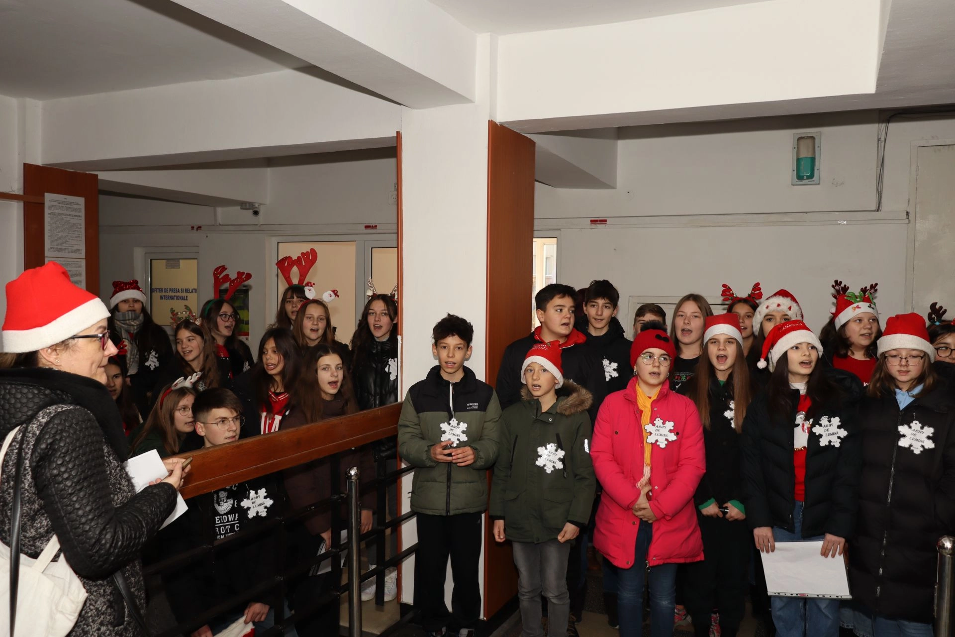 În sediul Inspectoratului de Poliţie Judeţean Bistriţa-Năsăud au răsunat colindele interpretate de corul elevilor ”Aripi de lumină”, sub coordonarea profesorilor de muzică, engleză și germană, doamnele, Simona Lolici și Roxana Moldovan.
