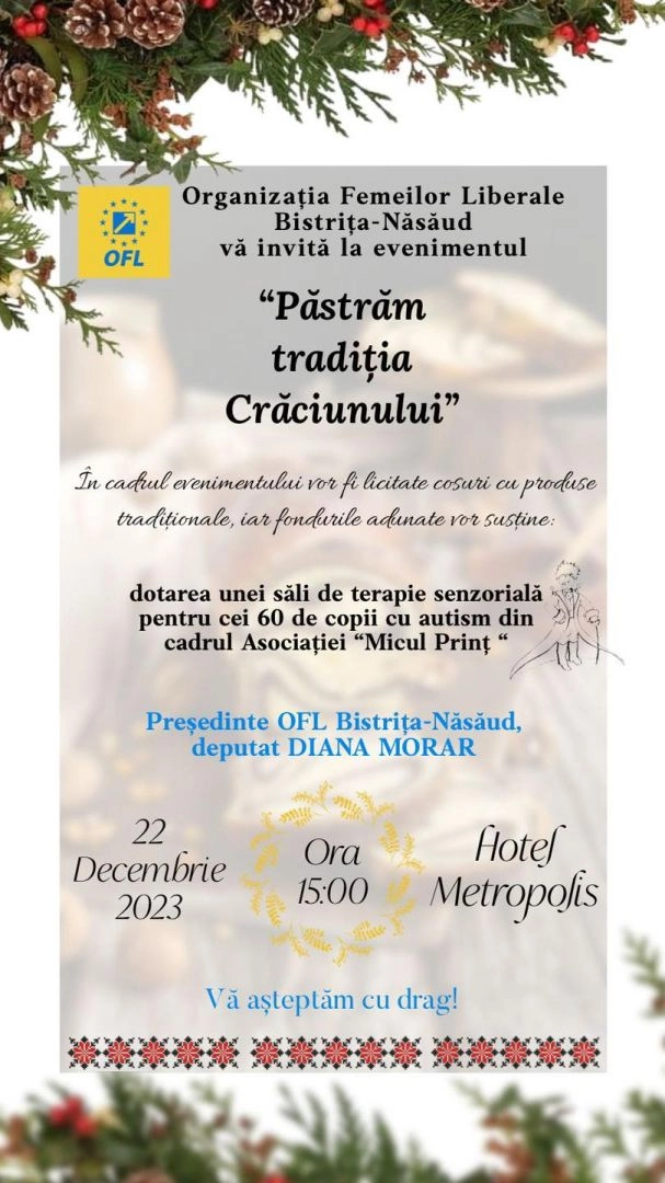 Organizația Femeilor Liberale Bistrița-Năsăud păstrează tradiția Crăciunului și organizează și în acest an un eveniment caritabil. De data asta, deputatul Diana Morar și femeile din PNL și-au propus să liciteze coșuri cu produse tradiționale, iar sumele licitate să fie folosite pentru dotarea unei săli de terapie senzorială pentru cei 60 de copii cu autism din cadrul Centrului de resurse și referință în autism “Micul Prinț”.