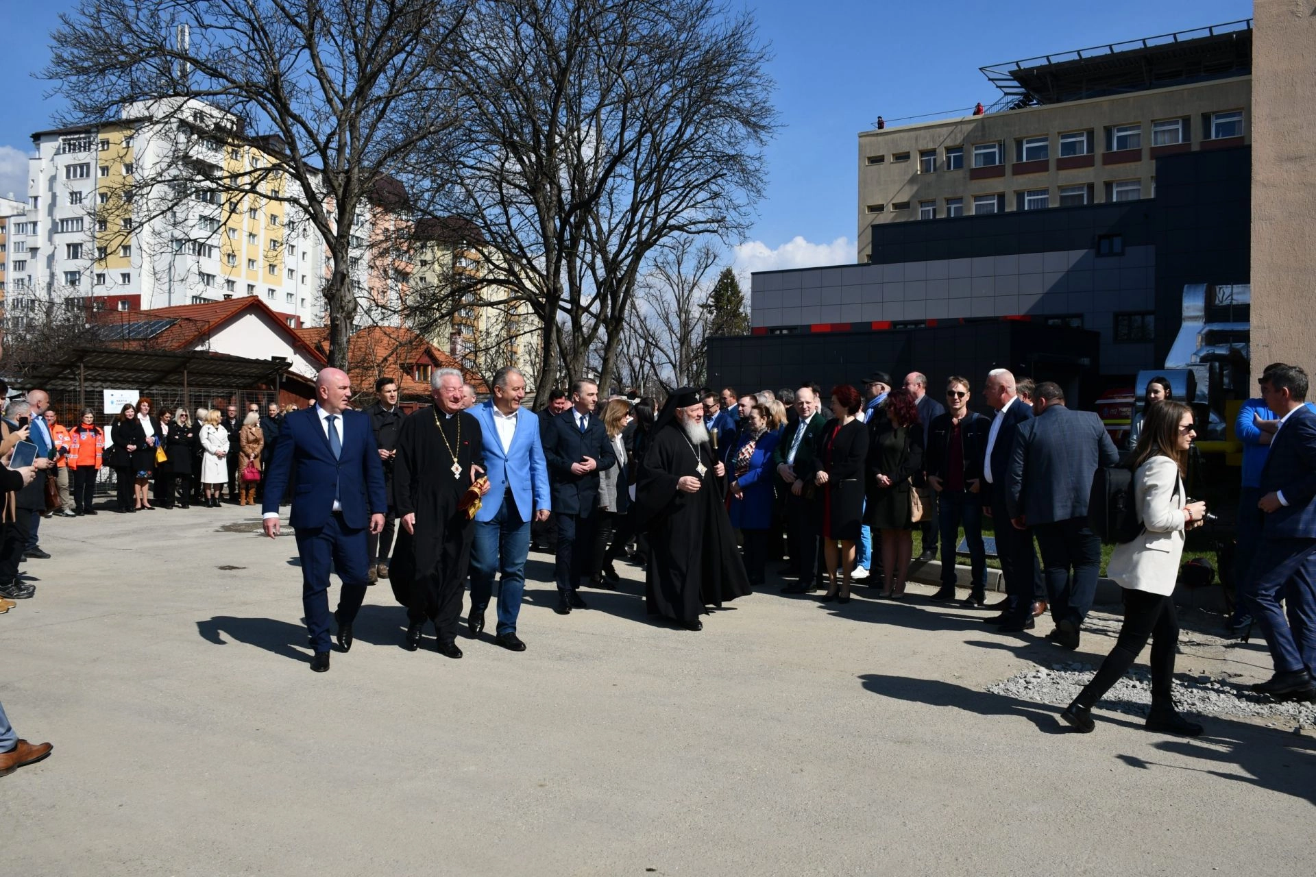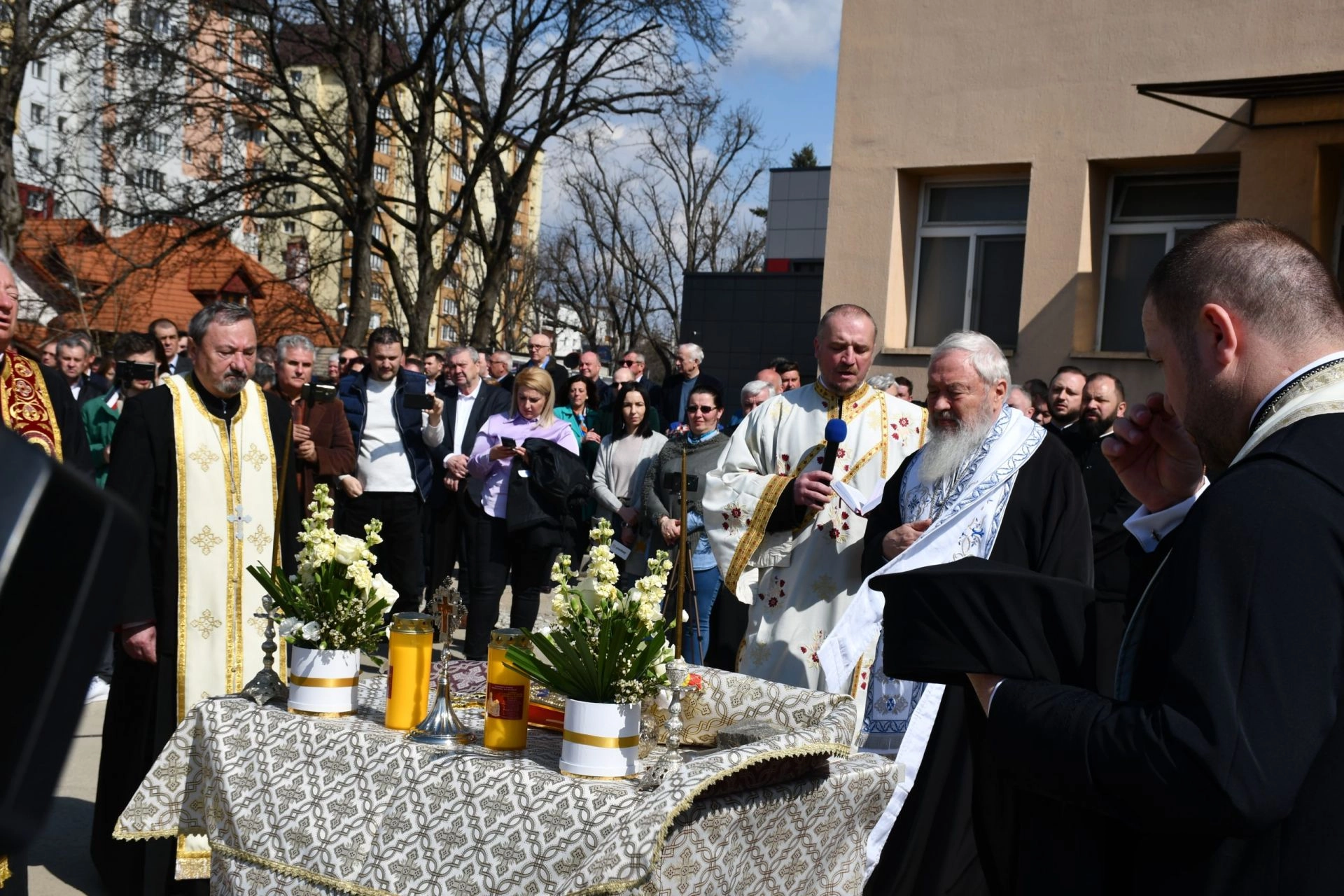 Înconjurat de un sobor de preoți, ÎPS Andrei a oficiat slujba de punere a pietrei de temelie și a binecuvântat locul unde va fi ridicată noua aripă a SJU Bistrița.