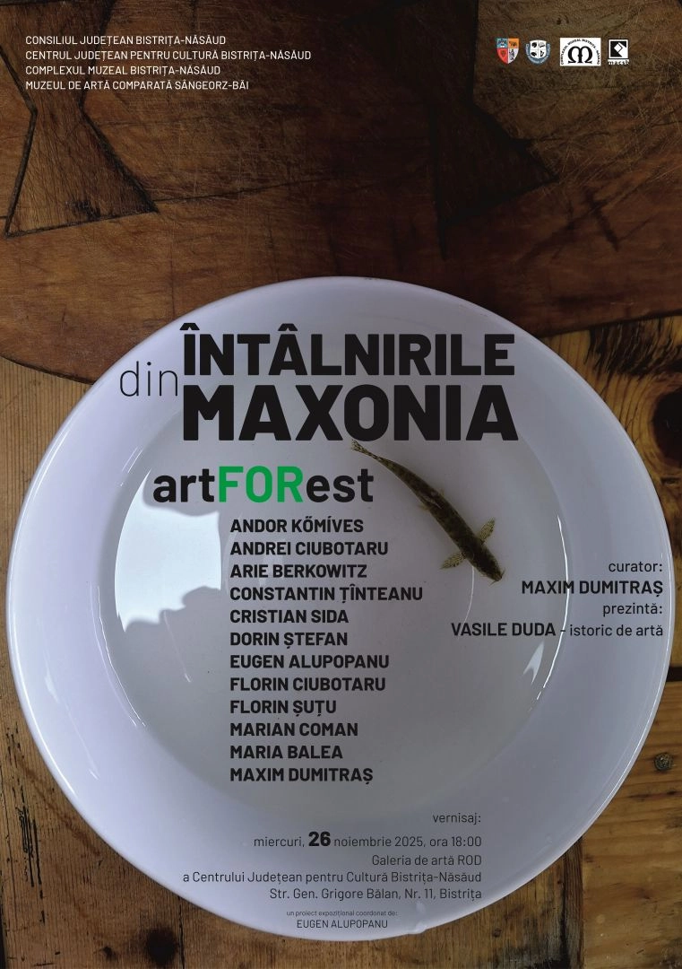 Centrul Județean pentru Cultură Bistrița-Năsăud, Consiliul Județean Bistrița-Năsăud, Complexul Muzeal Bistrița-Năsăud și Muzeul de Artă Comparată Sângeorz-Băi au plăcerea de a vă invita la vernisajul expoziției „Întâlnirile din Maxonia – artFORest”, miercuri, 26 noiembrie 2025, ora 18:00, la Galeria de artă ROD a Centrului Județean pentru Cultură Bistrița-Năsăud (Str. Gen. Grigore Bălan, nr. 11).