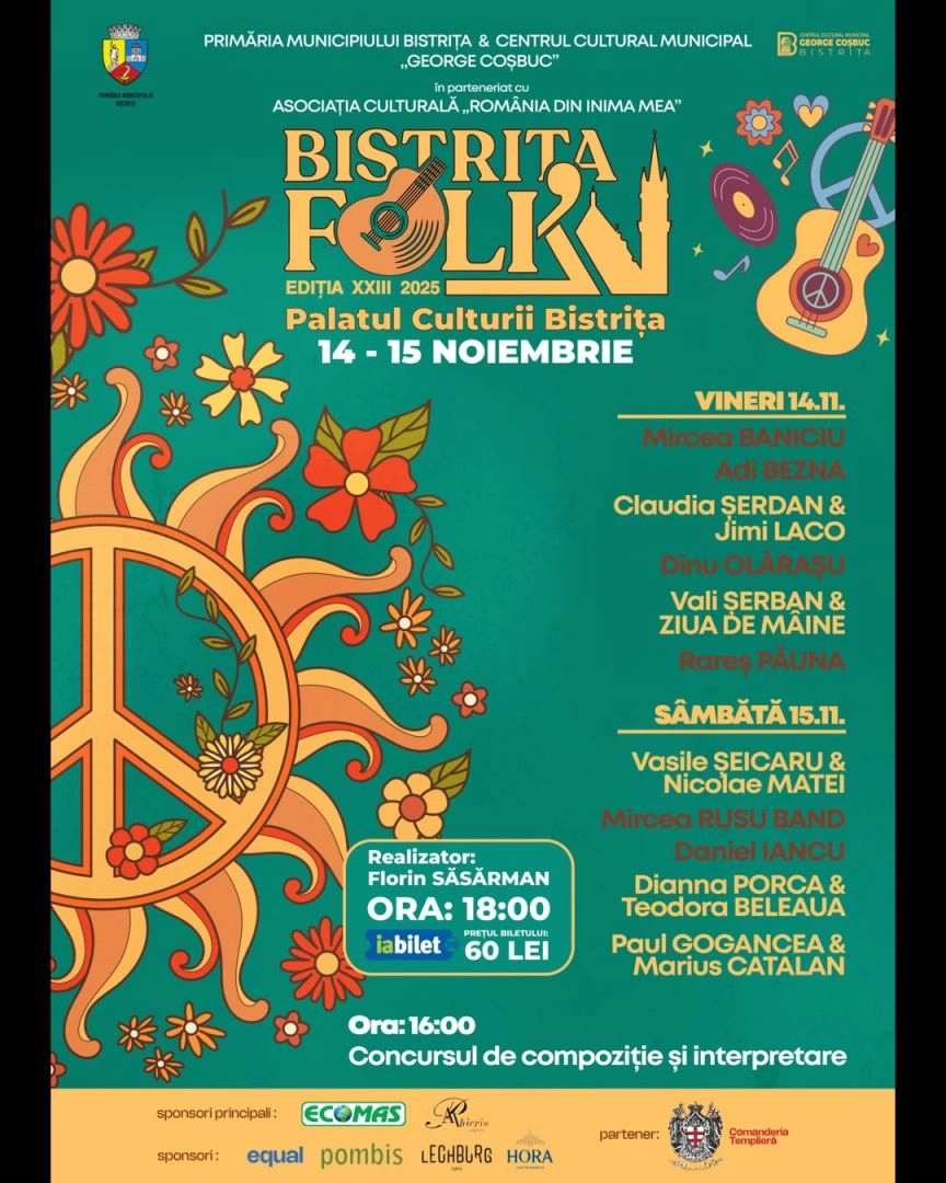 Festivalul Concurs BISTRIȚA FOLK a ajuns la cea de a XXIII-a ediție și se va desfășura în zilele de 14 şi 15 noiembrie 2025, de la ora 18:00, la Palatul Culturii.