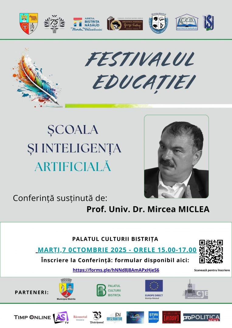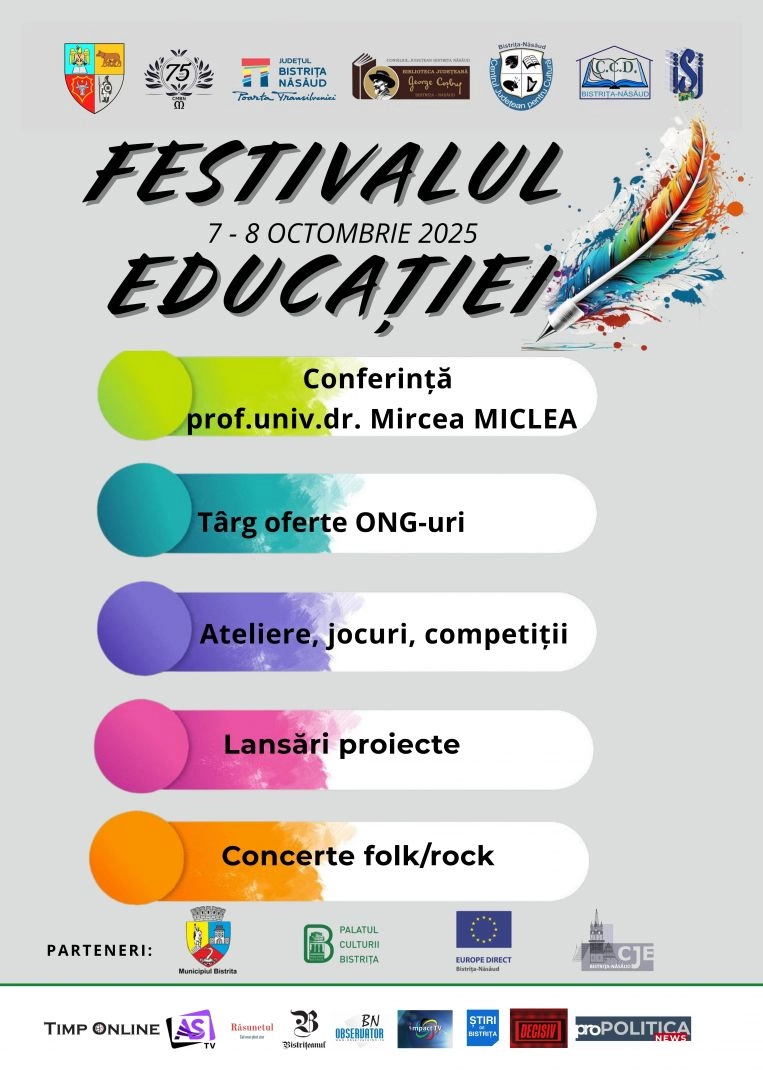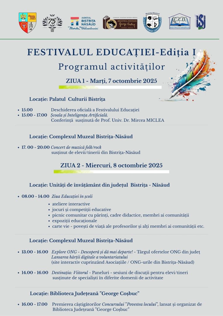 Bistrița găzduiește, în perioada 7–8 octombrie 2025, prima ediție a Festivalului Educației, un eveniment dedicat școlii, inovației și comunității. Organizat sub semnuldialogului dintre generații și al deschiderii spre viitor, festivalul aduce împreună profesori, elevi, părinți, specialiști și ONG-uri, într-un program variat care îmbină știința, educația și spiritul comunitar