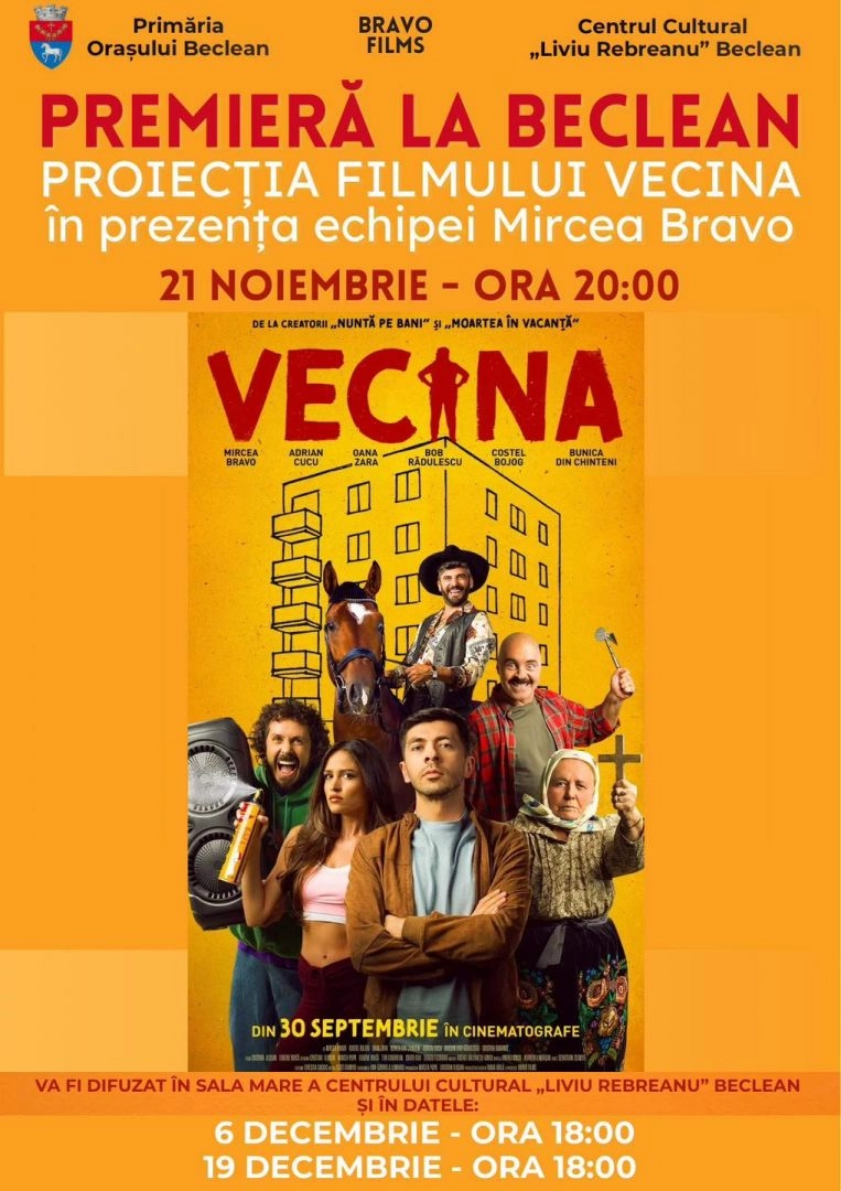"În premieră la Beclean, vă invit cu bucurie să vizionăm împreună filmul Vecina, realizat de Mircea Bravo și Cristian Ilișuan", a anunțat primarul Orașului Beclean, Nicolae Moldovan.