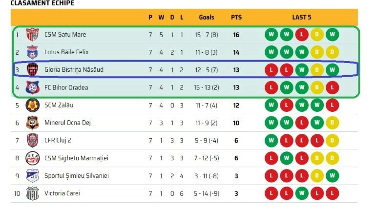 De vineri după-amiază și până ieri seară, Gloria Bistrița, echipă antrenată de Adrian Falub și care evoluează în seria a 10-a a Ligii cu numărul 3, a ocupat primul loc în clasament, asta după victoria contra Zalăului, scor 3-1 pe ”Jean Pădureanu”.