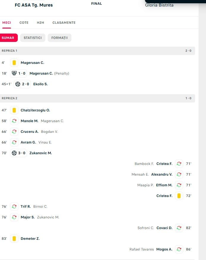 ASA a mai marcat un gol și în partea secundă, prin Zukanovic, care a stabilit scorul final, 3-0, în minutul 70, după o nouă gafă în apărarea Gloriei. Înfrângere fără drept de apel pentru Gloria Bistrița, care continuă să se zbată în subsolul clasamentului, cu doar șase puncte obținute până acum, în timp ce ASA Târgu Mureș urcă pe locul 4.