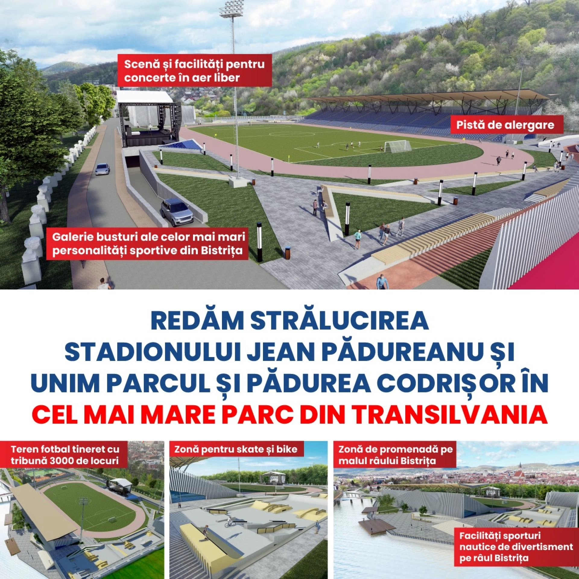 Avem astăzi unul dintre cele mai mici parcuri municipale raportat la populația orașului, aspect evidențiat de aglomerarea din zilele libere sau în serile de vară. De aceea, vom regândi toată zona, integrând stadionul și Pădurea Codrișor într-un spațiu unitar de petrecere a timpului liber. Odată acest proiect implementat, vom avea un spațiu generos și destinat tuturor bistrițenilor, de toate vârstele, a subliniat Gabriel Lazany.