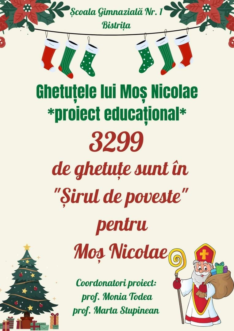 "Ghetuțele lui Moș Nicolae" proiectul educațional inițiat de Școala Gimnazială Nr. 1 Bistrița a ajuns la final! 3399 de ghetuțe sunt în ,,Șirul de poveste" pentru Moș Nicolae.
