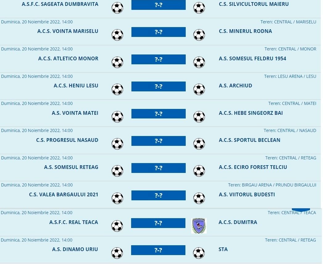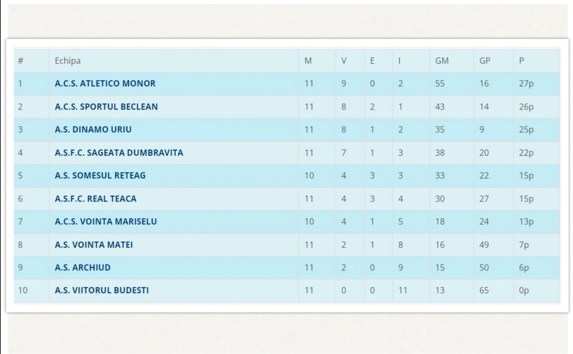 Turul campionatului de fotbal județean, liga a patra s-a încheiat duminică, 13 noiembrie, cele două serii, nord, respectiv sud, stabilindu-și liderii de toamnă dar și echipele ”corigente”. Liderii toamnei sunt Maieru, respective Monorul. În seria Sud, Viitorul Budești este echipa care nu a câștigat nici măcar un singur punct, având 11 înfrângeri, iar Someșul Feldru, echipă care s-a bătut în vară pentr a accede cât mai sus în Cupa României abia respiră cu 2 puncte pe ultimul loc al clasamentului.
