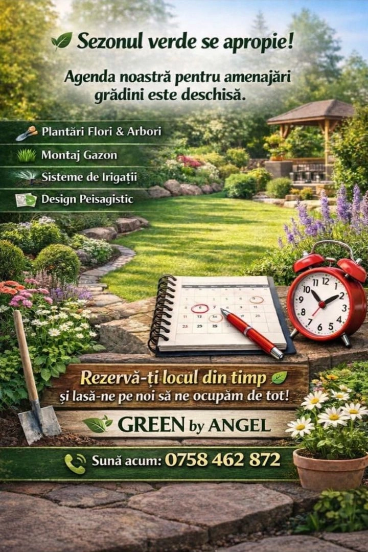 Dacă îți dorești ca grădina ta să arate impecabil, un spațiu verde armonios sau o curte complet transformată, Green By Angel Bistrița îți pune la dispoziție servicii complete de amenajare și întreținere, adaptate fiecărui tip de teren și fiecărui proiect. Primăvara bate la ușă, iar o simplă rezervare făcută din timp este primul pas pentru ca proiectul tău peisagistic mult visat să prindă viață.