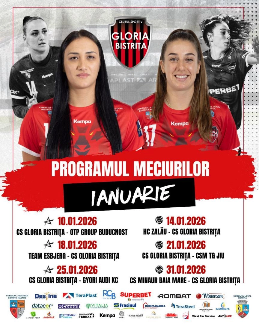 Gloria Bistrița dispută mai multe partide în luna ianuarie, atât în Liga Florilor, cât și în Liga Campionilor.