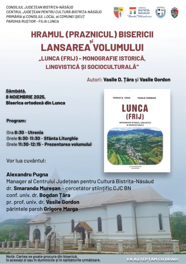 Consiliul Județean Bistrița-Năsăud, Centrul Județean pentru Cultură, Primăria Șieuț, Parohia Ruștior organizează Hramul Bisericii din Lunca și lansarea volumului "Lunca - Frij - Monografie istorică, lingvistică și socio-culturală.