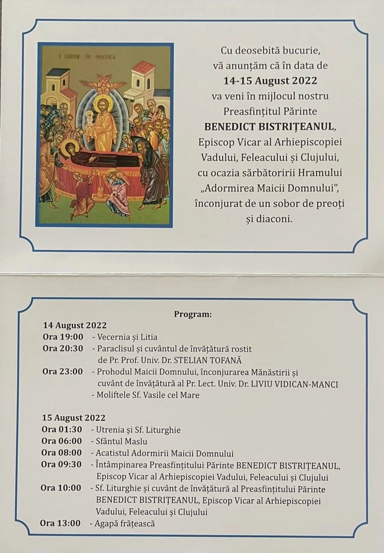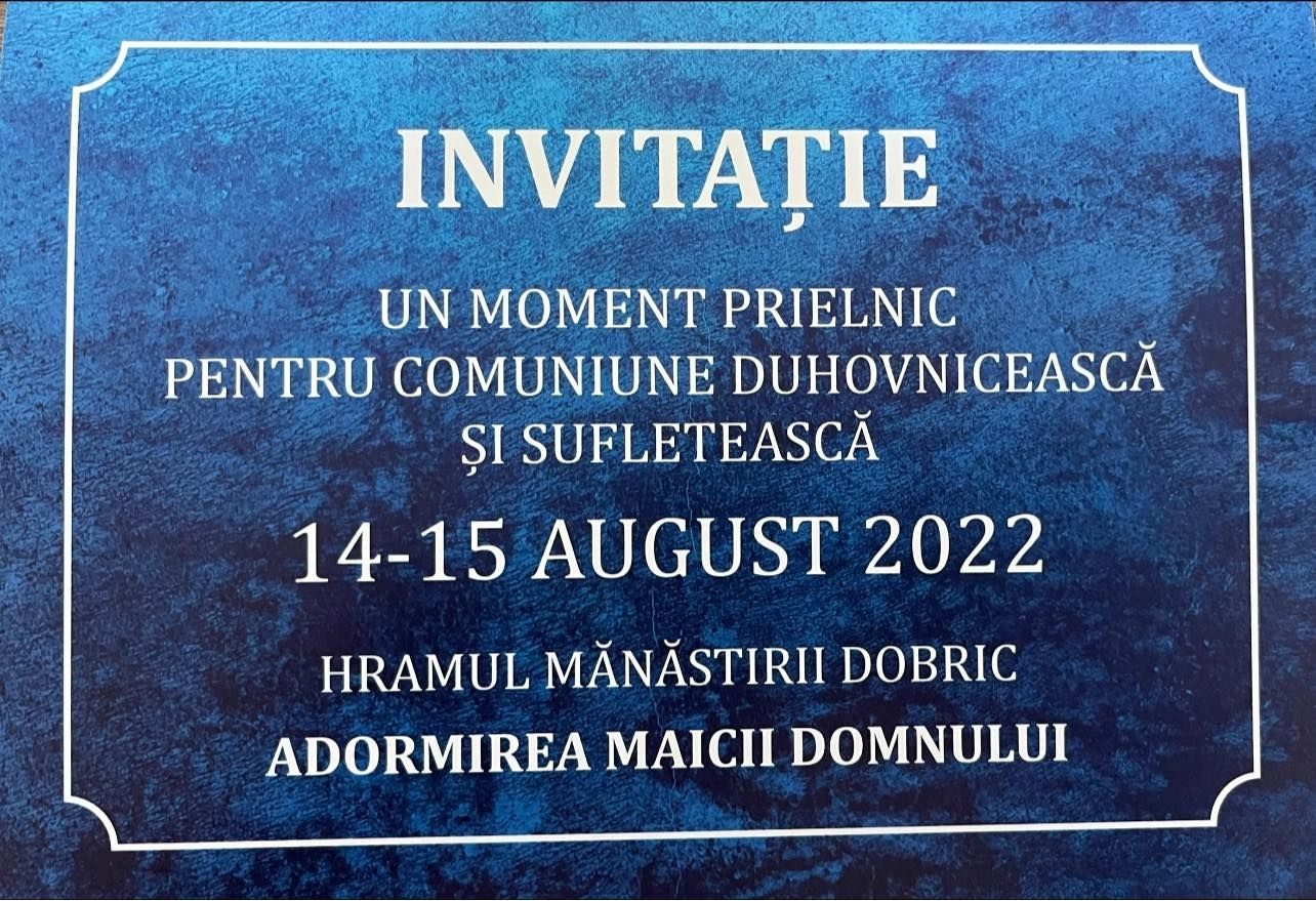 Hramul Mănăstirii Dobric va fi marcat prin slujbe care vor avea loc în 14-15 august, cu participarea PS Benedict Bistrițeanul Episcop-vicar al Arhiepiscopiei Vadului, Feleacului și Clujului.