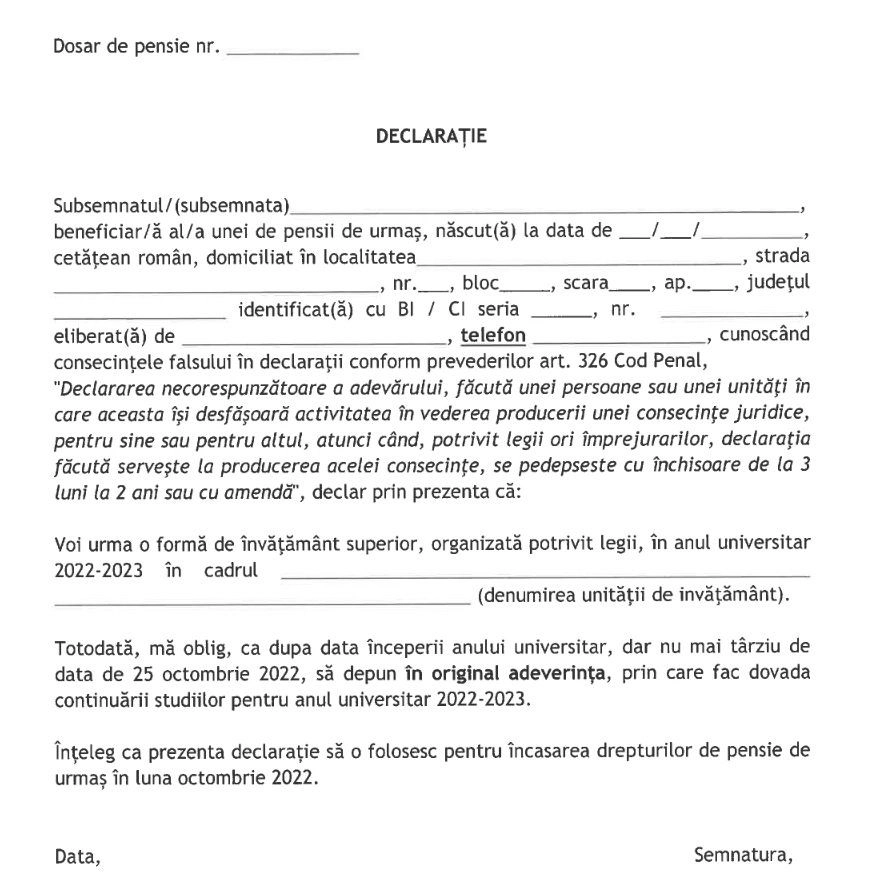 În cazul nedepunerii declarației, până la data de 25 septembrie 2022, pensia aferentă lunii octombrie va fi reținută de la plată, potrivit procedurii