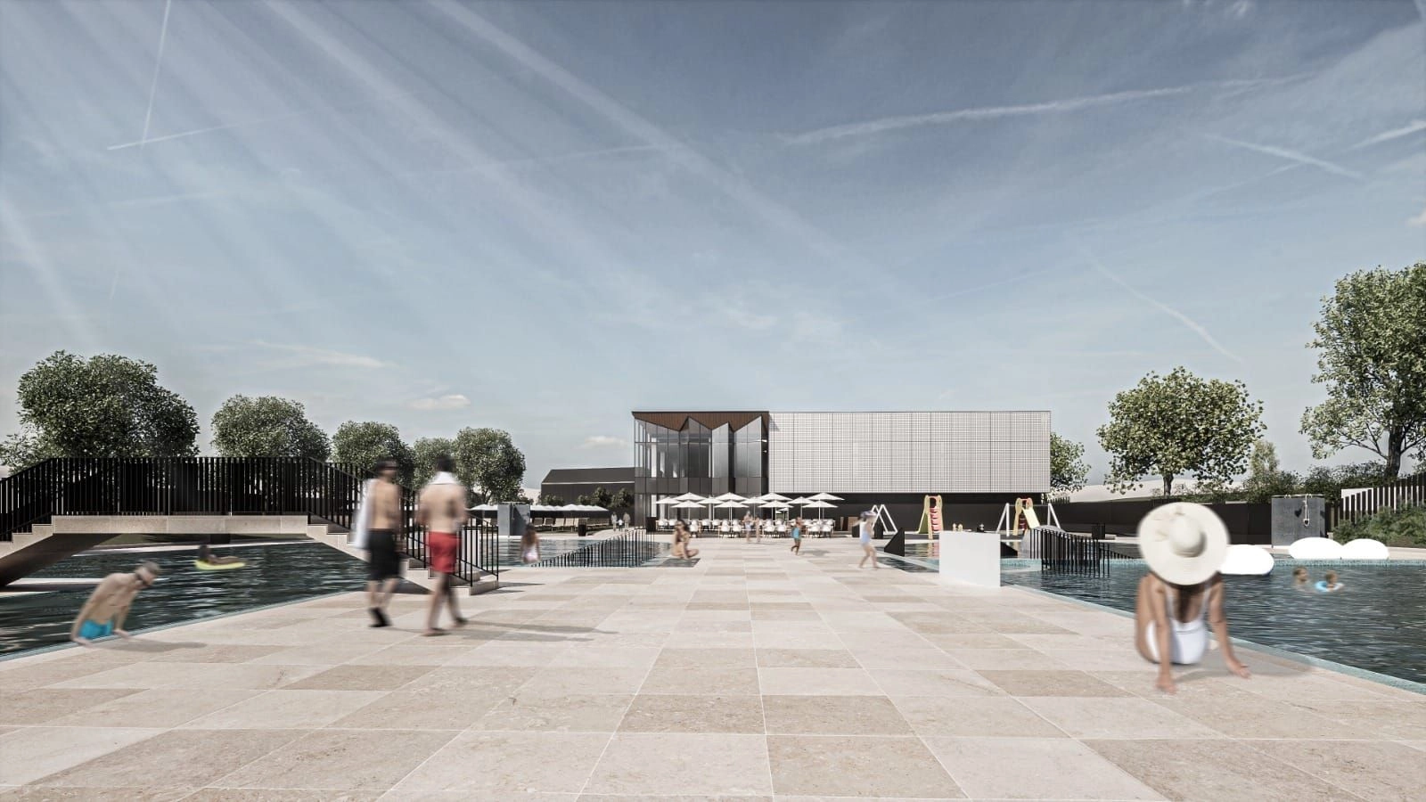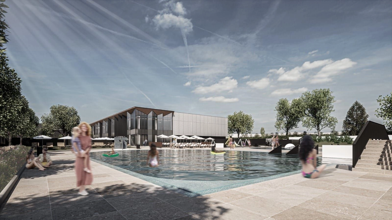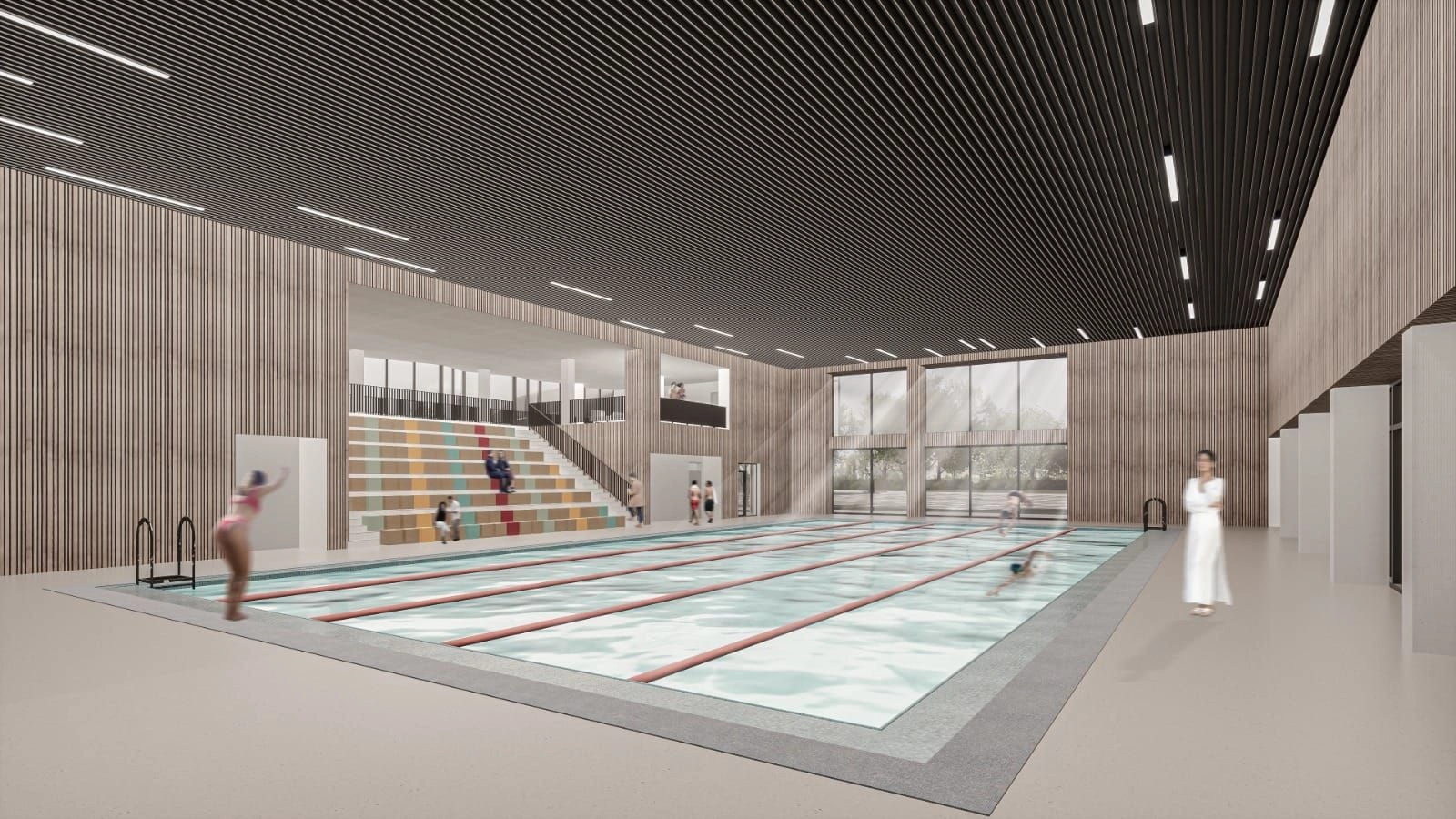 Clădirea principală va adăposti un bazin de înot (cu dimensiunea 25m x 12.5m) cu vestiare, inclusiv pentru bazinele exterioare, gradene pentru spectatori (150 de locuri), zonă de recuperare pentru sportivi (cu saună uscată și saună umedă), cabinet medical, zonă de alimentație publică, sală de fitness și sală pentru tenis de masă.