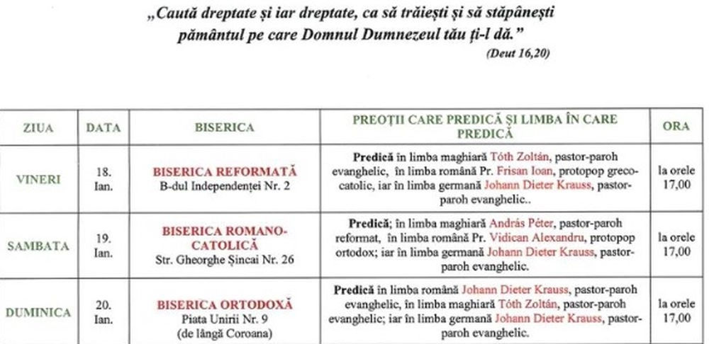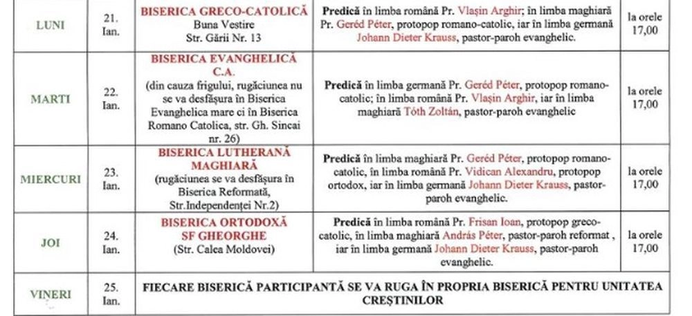 Săptămâna ecumenică va avea loc în perioada 18-25 ianuarie, în fiecare seară la orele 17.00, într-o biserică programată a fiecărui cult din bisericile istorice.