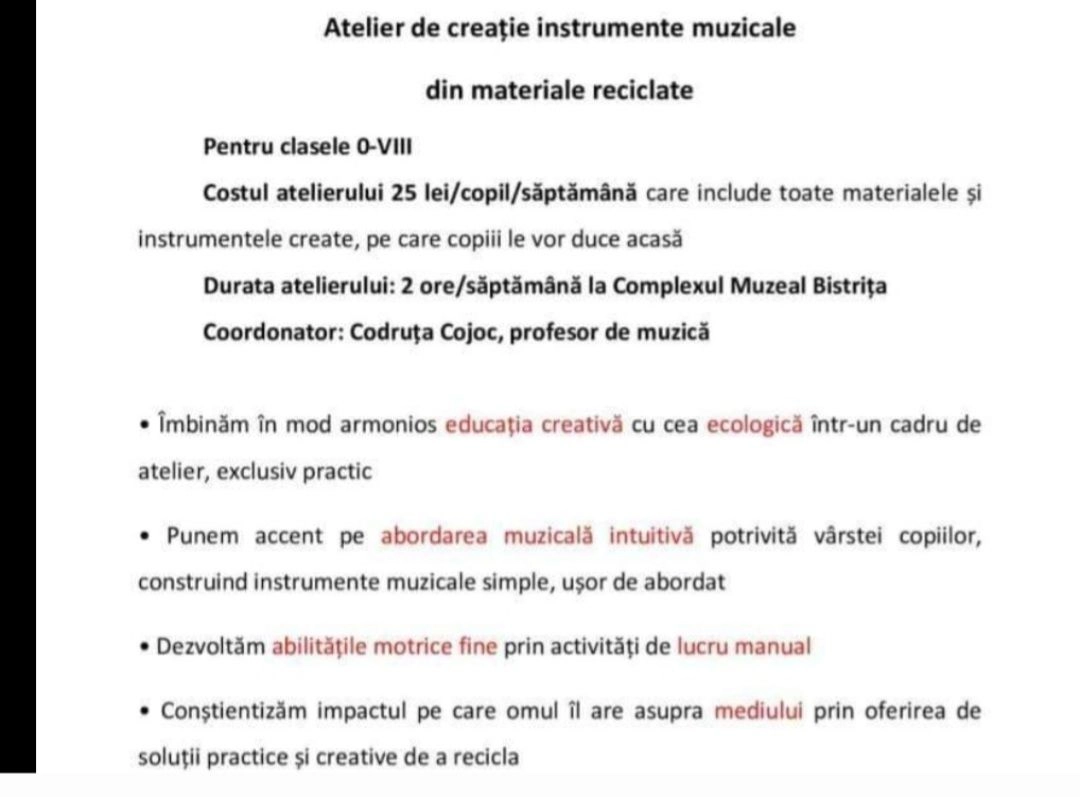 Codruța Cojoc, o profesoară de muzică din Bistrița, organizează ateliere de creație pentru copii. În cadrul acestor ateliere, copiii creează instrumente muzicale din materiale reciclate.