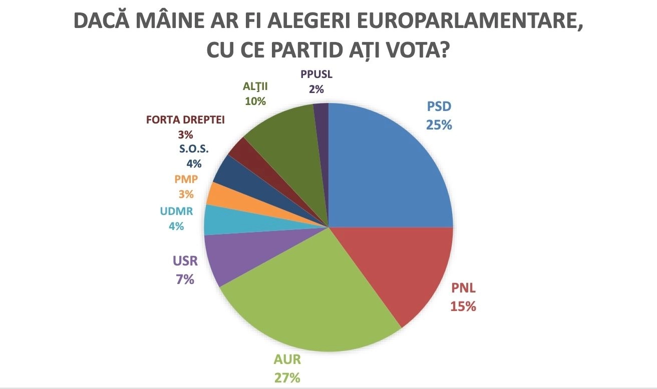 INSOMAR: Schimbare de paradigmă politică? AUR a ajuns pe primul loc în preferințele electorilor : 27%, PSD, 25 și PNL, 15%