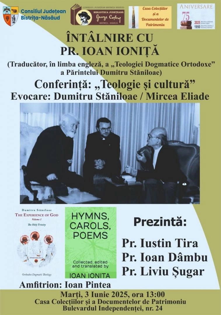 Consiliul Județean Bistrița-Năsăud, Biblioteca Județeană „George Coșbuc” Bistrița-Năsăud și Casa Colecțiilor și a Documentelor de Patrimoniu Bistrița organizează marți, 3 Iunie 2025, ora 13:00, Evenimentul Cultural: „Întâlnire cu Pr. Ioan Ioniță” (Traducător, în limba engleză, a „Teologiei Dogmatice Ortodoxe” a Părintelui Dumitru Stăniloae):