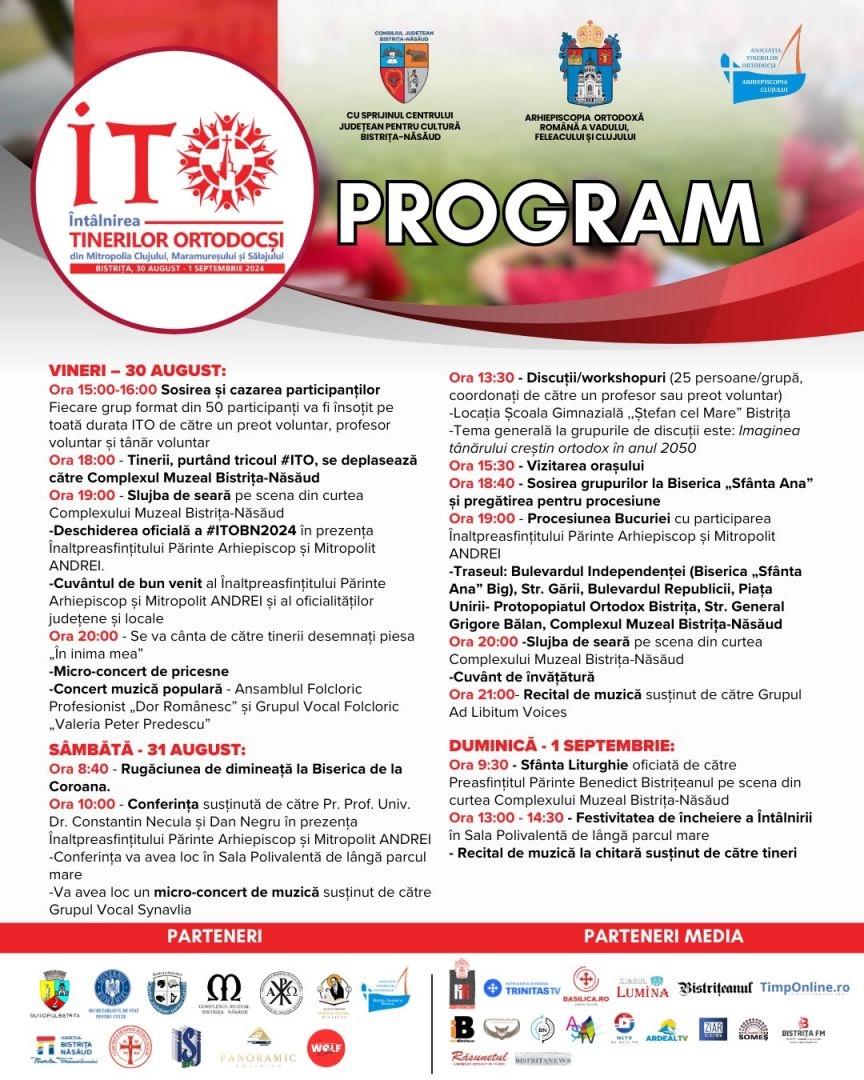 Cu binecuvântarea Înaltpreasfințitului Părinte Arhiepiscop și Mitropolit Andrei, comunitatea bistrițeană găzduiește în perioada 30 august-1 septembrie peste 1000 de tineri din cele cinci județe ale Mitropoliei și oferă o varietate de activități culturale, artistice, duhovnicești și educative, destinate participanților și publicului larg. Organizarea ITO la Bistrița, după 7 ani de la prima ediție locală a acestui eveniment, a venit în întâmpinarea nevoii de a propune schimburi de experiență între tineri, dintre care unii deja activează în asociațiile de tineret.