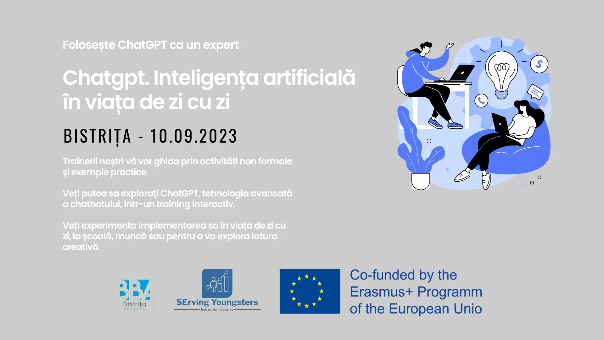 În cadrul proiectului Serving Youngsters, a avut loc la Bistrița, în data de 10 septembrie, cursul de instruire pentru folosirea instrumentele CHATGPT, curs organizat de Asociația Bistrița Business Academy.