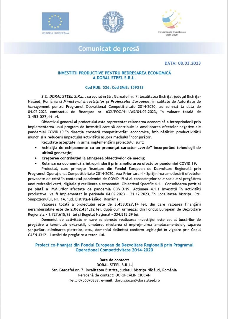 INVESTIȚII PRODUCTIVE PENTRU REDRESAREA ECONOMICĂ A DORAL STEEL S.R.L.