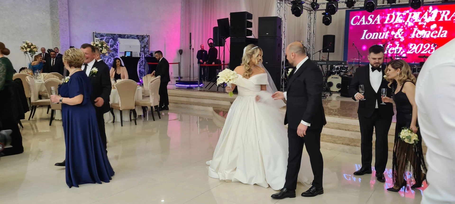 Mirele, Ionuț Simionca, a ales un costum negru, în timp ce mireasa, Ionela, poartă o rochie albă, lungă.