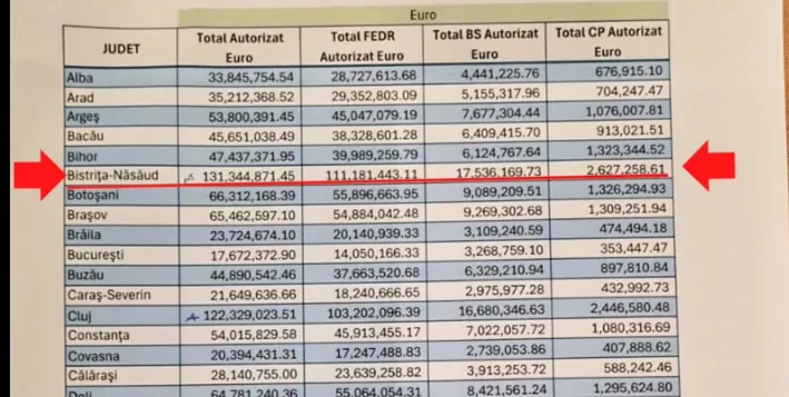 Președintele Consiliului Județean Bistrița-Năsăud, Radu Moldovan, a făcut publică lista centralizată a sumelor absorbite de fiecare județ din România din finanțări europene. Potrivit datelor oficiale, Bistrița-Năsăud a atras 131,344 milioane euro, fiind pe locul 1 în topul național.