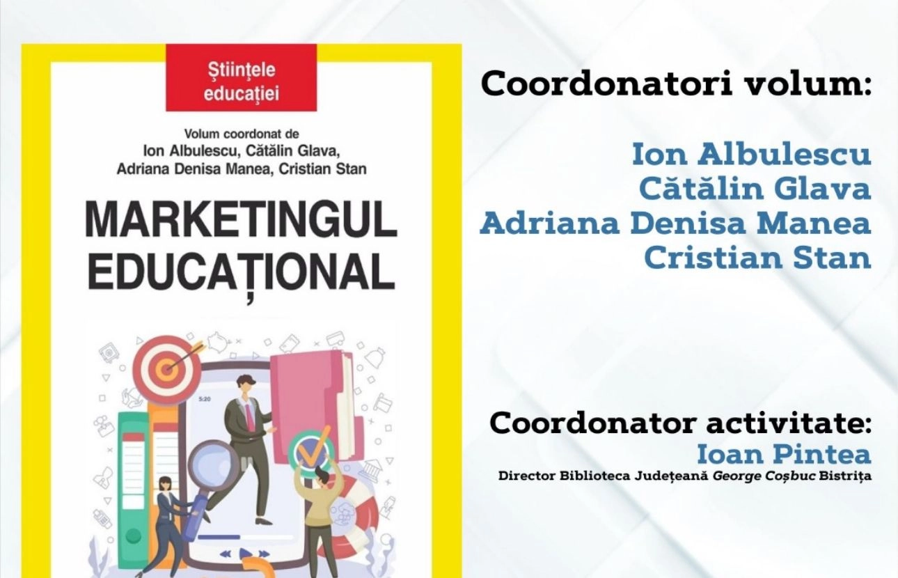 Inspectoratul Școlar Județean Bistrița-Năsăud, Casa Corpului Didactic Bistrița-Năsăud, Consiliul Județean Bistrița-Năsăud, Biblioteca Județeană „George Coșbuc” și Centrul Județean pentru Cultură Bistrița-Năsăud au plăcerea să anunțe lansarea volumului „Marketingul educațional”, coordonat de Ion Albulescu, Cătălin Glava, Adriana Denisa Manea și Cristian Stan.