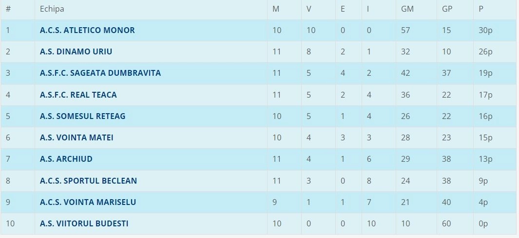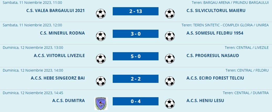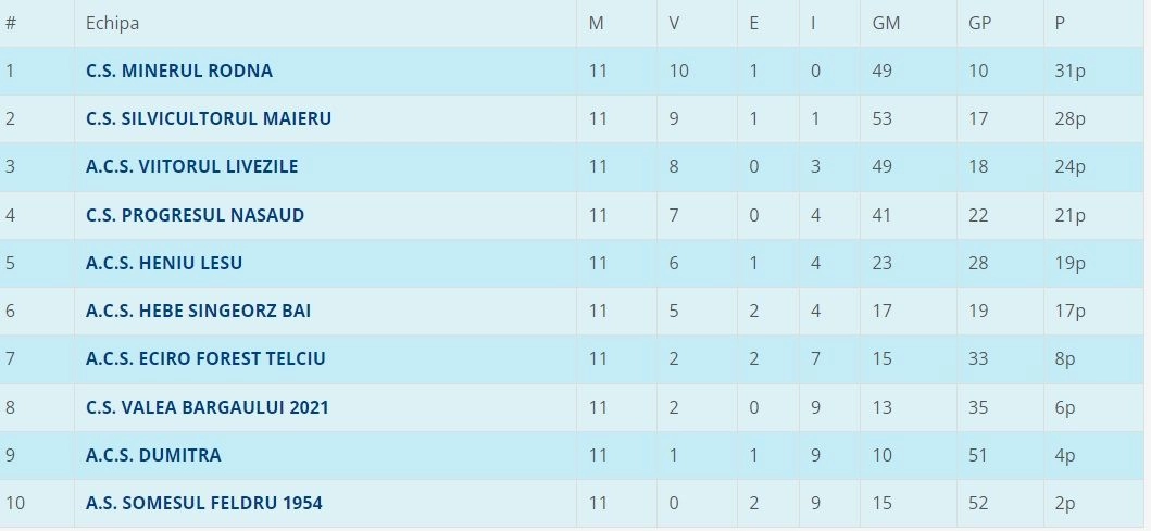Prima certitudine o avem în SERIA NORD, acolo unde, aceeași echipă Minerul Rodna s-a distanțat la 31 de puncte, la trei puncte de ocupanta locului 2, Silvicultorul Maieru și la 7 puncte de numărul 3, Viitorul Livezile. Avem și scorul turului competițional, partida dintre Valea Bârgăului și Maieru încheindu-se cu scorul de 2-13, în timp ce Livezile execută Năsăudul cu 5 la 0.