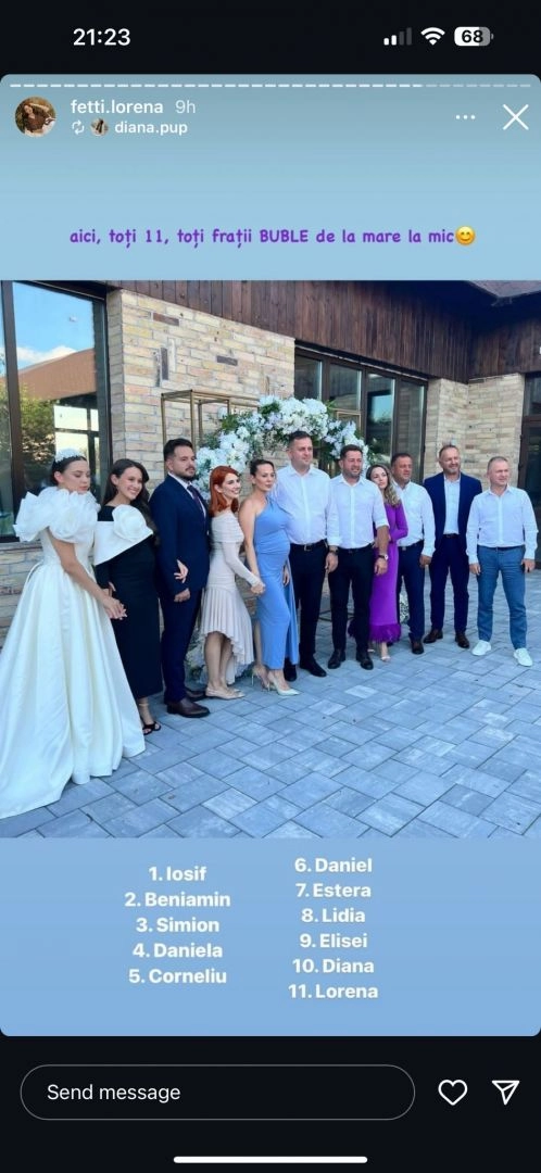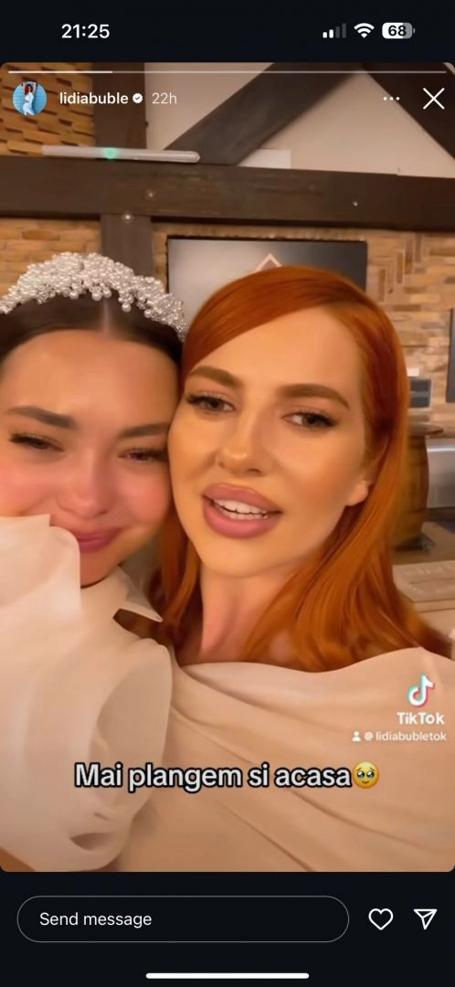 Vizibil emoţionată, Lidia Buble a transmis un mesaj de la nunta surorii sale: "E ruptă de plâns. Uitați trădătoarea, care m-a trădat. A zis că nu se căsătorește. Nu mai plânge, că mă faci și pe mine! Nu mai ești mezina, acum eu am rămas. Hai, Lori, că astea sunt lacrimi de fericire. Ai fost cea mai frumoasă mireasă. Ai avut o petrecere minunată și îți doresc să ai parte de o viață binecuvântată, cu lacrimi numai de fericire”, a spus Lidia Buble.