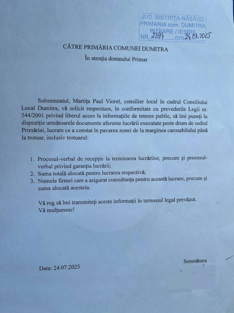 Consilierul local USR în comuna Dumitra, Martița Paul, a transmis o solicitare oficială către Primărie (înregistrată cu nr. 2394/24.07.2025), conform Legii 544/2001 privind liberul acces la informațiile de interes public.
