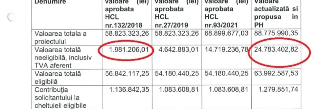 În acest sens, urmare a creșterii valorii devizului general prin aplicarea OUG nr. 64/2022, se modifică contribuţia proprie în proiect a Municipiului Bistriţa, de la 15.802.845,57 lei la 26.063.254,56 lei, reprezentând atât cheltuielile neeligibile ale proiectului, cât şi contribuţia de 2% din valoarea eligibilă a proiectului.