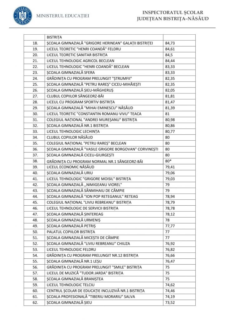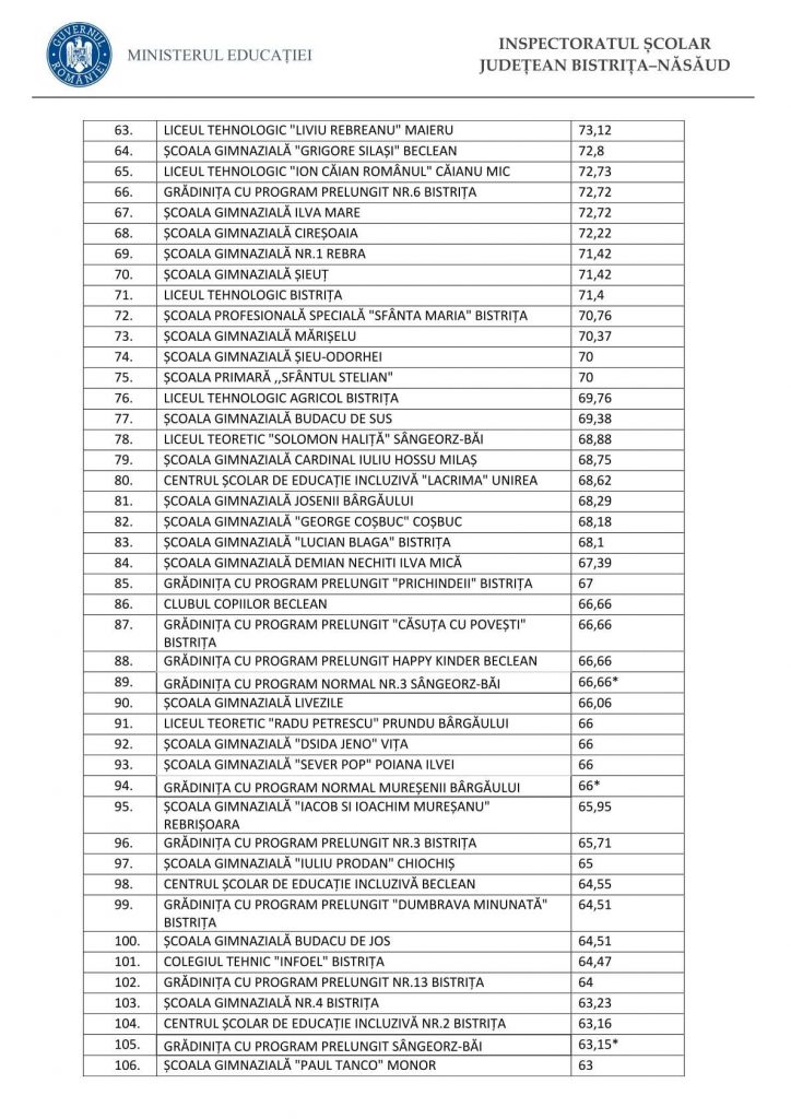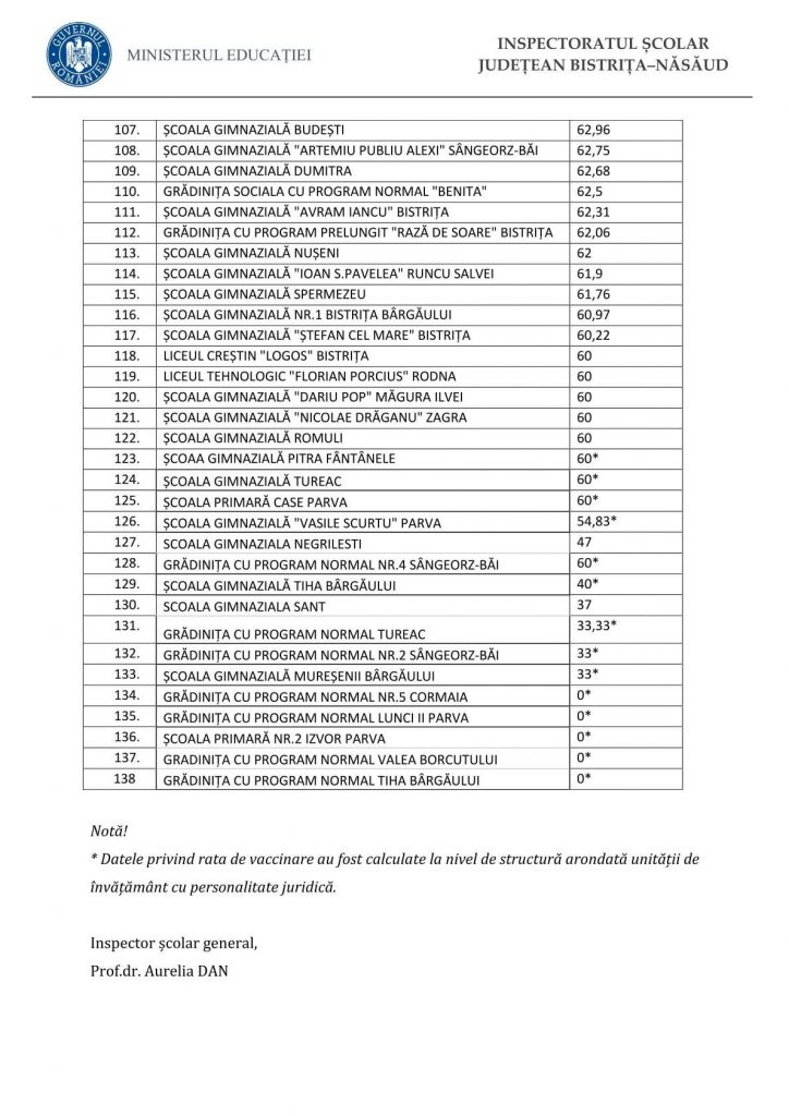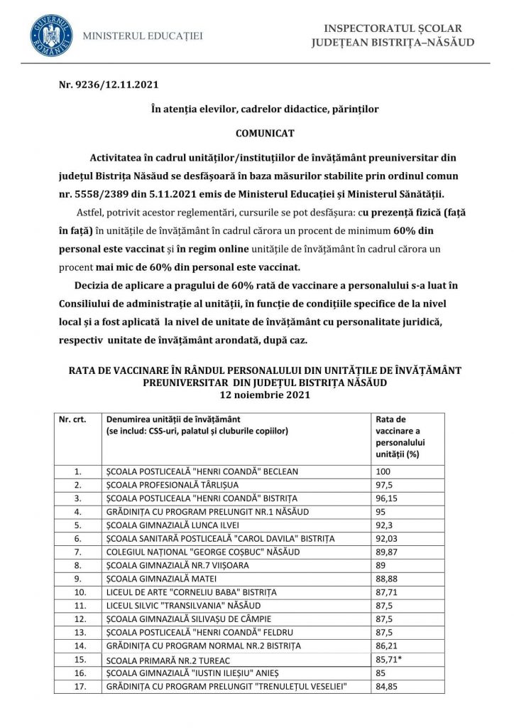 Inspectoratul Școlar Județean Bistrița-Năsăud a publicat precizări privind modalitatea reluării cursurilor în unitățile de învățământ preuniversitar din județ. În momentul de față, doar 11 unități de învățământ din Bistrița-Năsăud nu au atins încă pragul de vaccinare de 60% în rândul personalului.