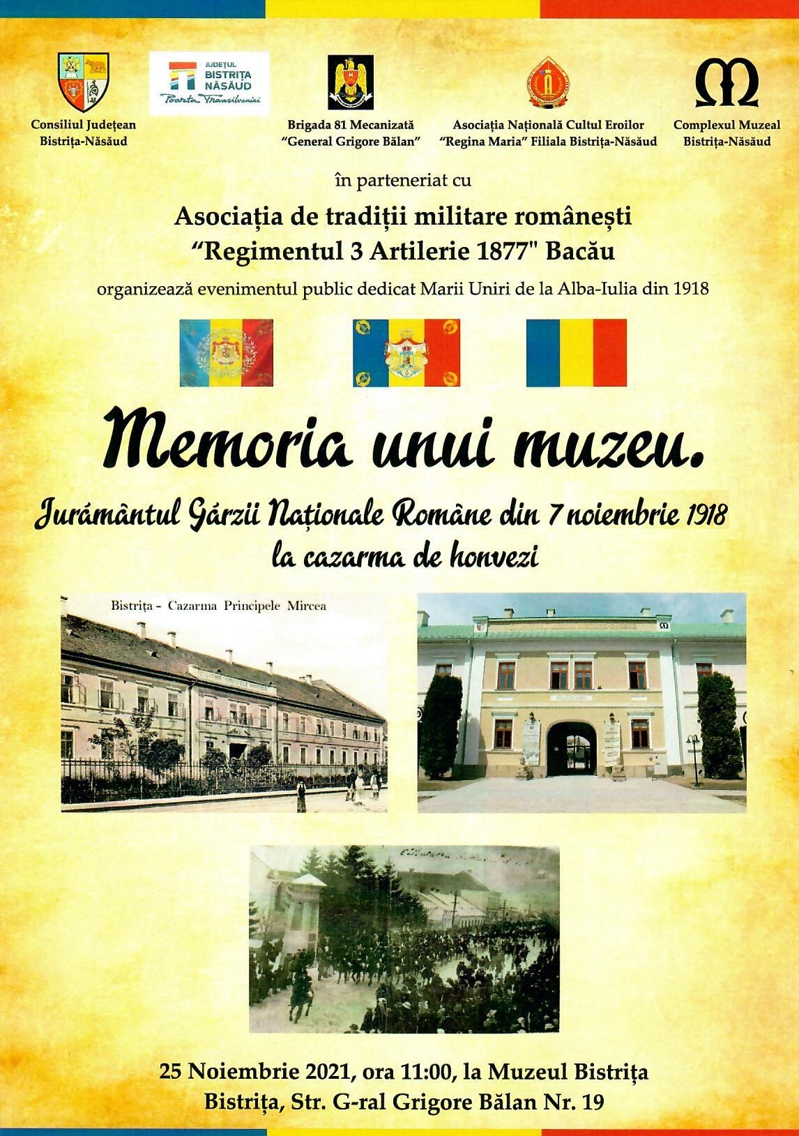 Complexul Muzeal Bistrița-Năsăud în parteneriat cu Asociația Națională Cultul Eroilor ,,Regina Maria”, Filiala județeană ,,Colonel Liviu Rusu”, Brigada 81 Mecanizată ,,General Grigore Bălan” și Asociația de Tradiții Militare Românești din Bacău organizează în data de 25 noiembrie 2021, începând cu orele 11ºº, manifestarea culturală ,,Memoria unui Muzeu. Jurământul Gărzii Naționale Române din Bistrița la data de 7 noiembrie 1918”. Evenimentul va avea loc în curtea Muzeului Bistrița.