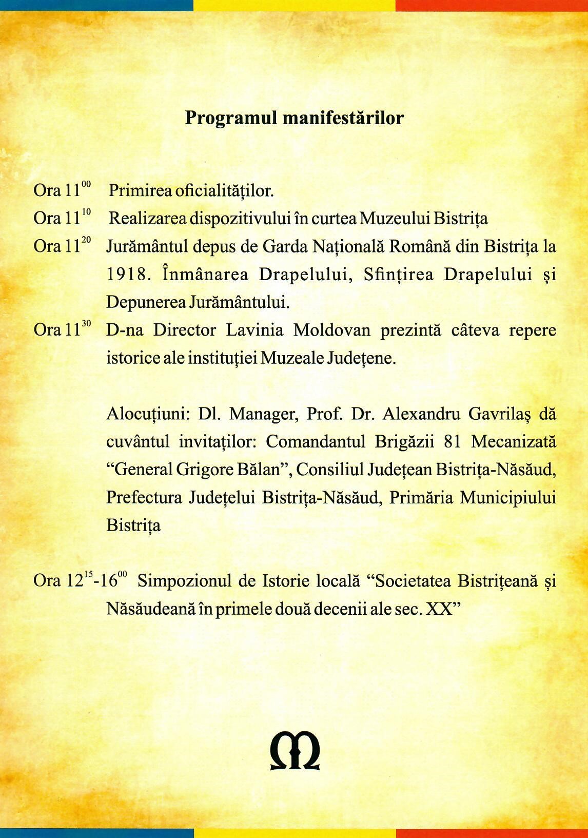 Evenimentul public se va desfășura în curtea Muzeului bistrițean (fosta cazarmă de honvezi a armatei austro-ungare, din 1919 Cazarma ,,Principele Mircea”), strada General Grigore Bălan nr. 19 urmând ca, de la ora 12ºº, să se desfășoare lucrările Simpozionului de istorie locală ,, Societatea bistrițeană și năsăudeană în primele două decenii ale secolului al XX-lea”.