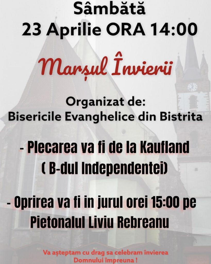 Marșul Învierii, un eveniment la care sunt invitați să participe creștinii de la toate confesiunile, va avea loc sâmbătă, pe străzile municipiului Bistrița. Marșul Învierii este un eveniment de tradiție, de Paște, care a fost întrerupt în perioada pandemiei, fiind reluat acum. Marșul este organizat de Bisericile Evanghelice din Bistrița. Plecarea va avea loc de la ora 14.00, din zona Kaufland de pe Bulevardul Independenței.