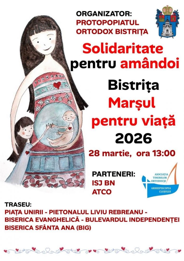 Protopopiatul Ortodox Român Bistrița, în parteneriat cu Asociația Tinerilor Creștini Ortodocși Bistrița-Năsăud și Inspectoratul Școlar Județean Bistrița-Năsăud, organizează sâmbătă, 28 martie, o nouă ediție a Marșului pentru Viață.