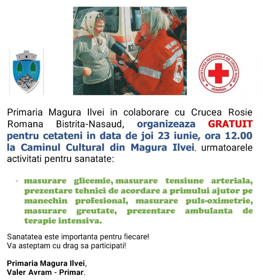Primăria Măgura Ilvei, în colaborare cu Crucea Roșie Bistrița-Năsăud, organizează, pentru cetățeni, mai multe activități pentru sănătate.