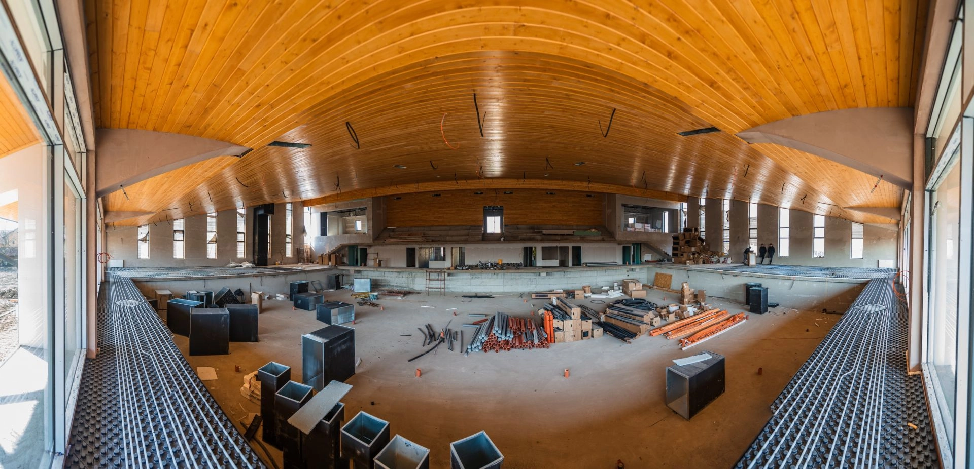 Pe șantier, echipele de muncitori sunt mobilizate pentru a respecta graficul de execuție, în această perioadă fiind desfășurate lucrări esențiale pentru finalizarea obiectivului. Se lucrează la instalațiile termice și la sistemele de ventilație, componente importante pentru asigurarea unui climat interior optim. De asemenea, au loc turnări de șape atât la nivelul subsolului, cât și la etaj, precum și lucrări de infrastructură exterioară, care includ săpături și montarea cablajelor pentru viitorii stâlpi de iluminat.