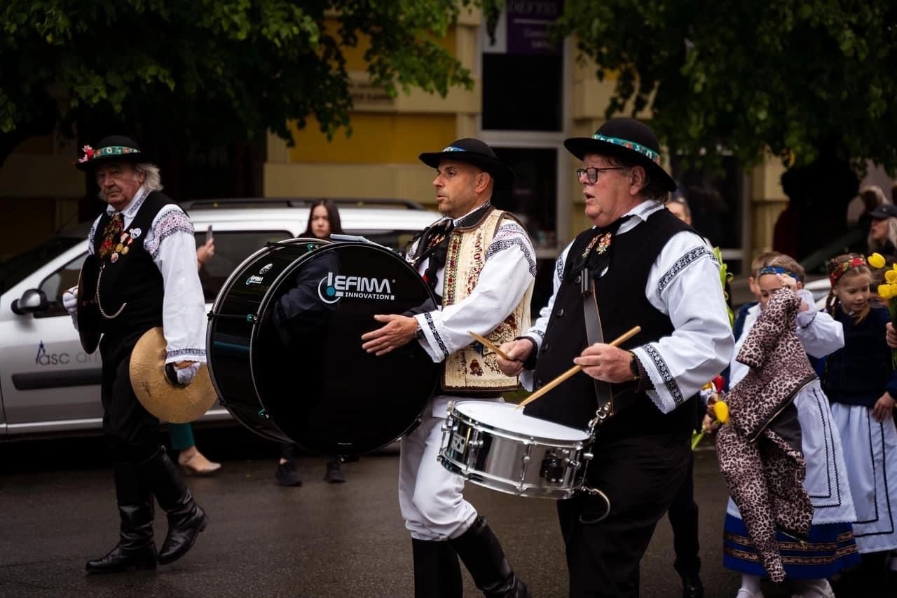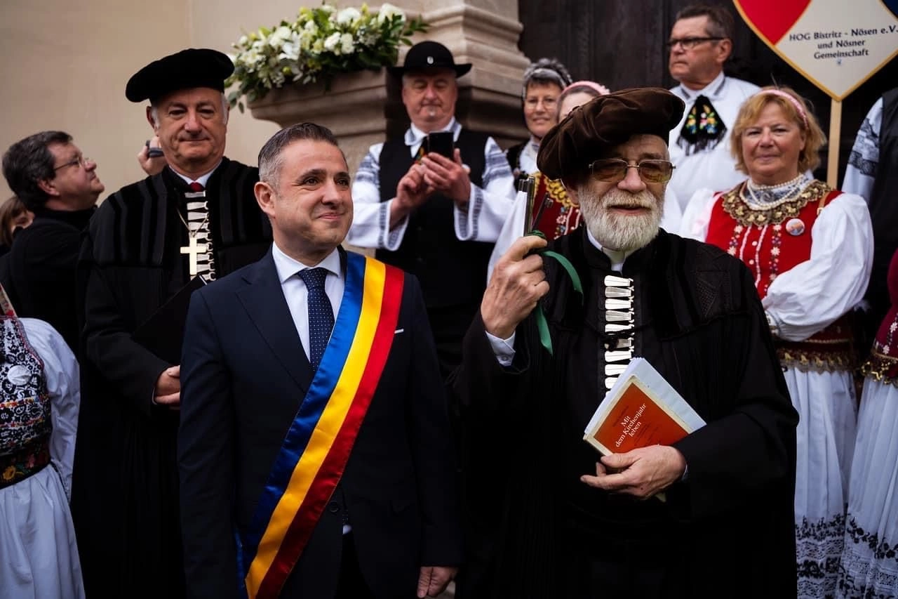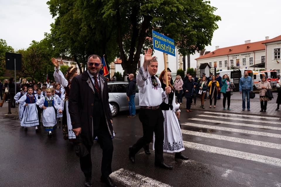 Evenimentul care a marcat resfințirea Bisericii Evanghelice a debutat cu o paradă a portului popular al sașilor, în acordurile fanfarelor din Bistriţa, Germania şi Austria, pe traseul Piața Unirii – Pietonalul Liviu Rebreanu – Piața Centrală.