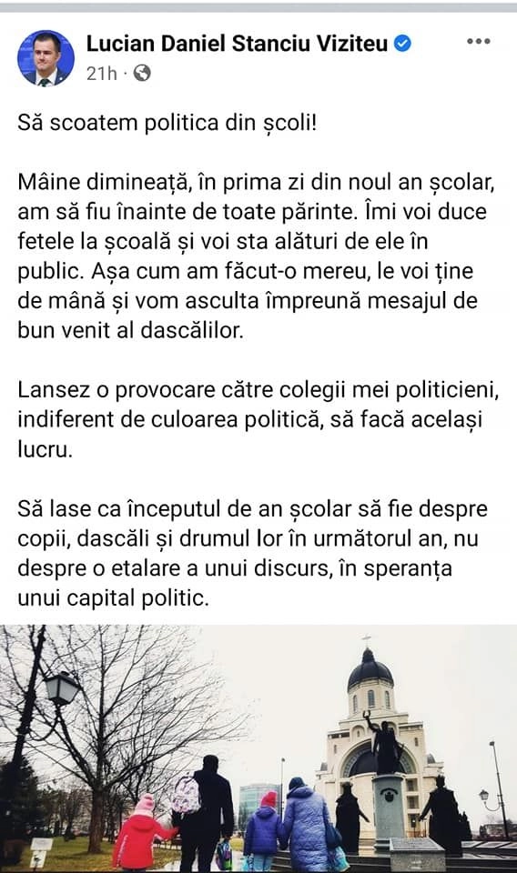 Dacă aș fi părintele acestor copii din pozele postate de voi, v-aș da în judecată pentru că vă folosiți de imaginea copiilor fără nici un drept. În contraexemplu, vă arăt cum a procedat Primarul Municipiului Bacău, care a mers și el ca orice alt părinte simplu, alături de copilul său la școală. Deschiderea anului școlar ar trebui să fie doar despre copii, despre dascăli și despre drumul lor în noul an, nu despre discursuri politice și felicitări pentru așa zisele realizări ale politicienilor", a transmis Nicolae Pavelean.